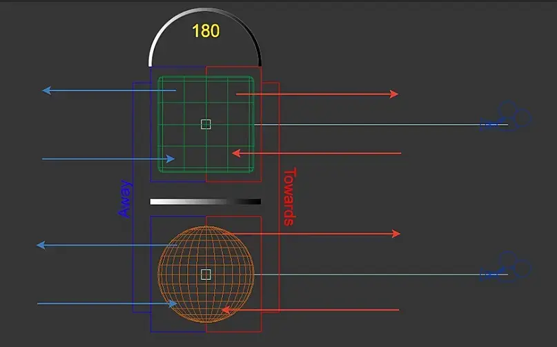 Происходит диапазон спада между нормалями граней, которые параллельно направлены/смотрят в камеру - Towards и нормалями граней - Away, которые направлены/смотрят в противоположную на 180 градусов от них сторону.
