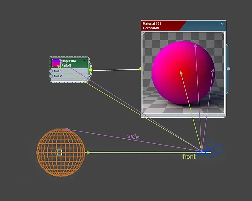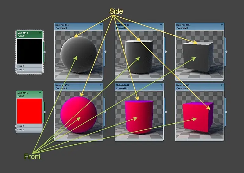 Происходит спад (falloff) между фронтальными(Front) нормалями граней, которые перпендикулярны к боковым (Side) нормалям граней и смотрят в камеру; и боковыми (Side) нормалями граней - которыми считаются грани, развернутые на 90 градусов от фронтальных.