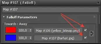 Галочки - данные галочки позволяют включать или отключать отображение/использование текстуры в карте Falloff. Когда галочки присутствуют, это означает, что текстуры используются картой Falloff, когда отключены - используют только цвета.