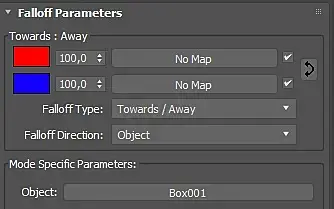 Происходит направление спада (Falloff) от указано объекта(центра объекта) в сцене. Что бы это сделать, стоит перейти в Mode Specific Parameters, нажать на None (данная возможность включается при выборе Falloff Directions>>Object ) и кликнуть мышкой на нужный объект, на который будет ориентироваться Falloff.