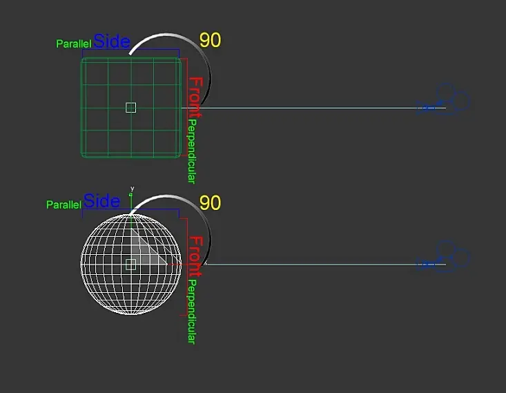 В данном типе Falloff(спада) мы так же имеет 2 типа граней - Front и Side. фронтальные (Front) грани находятся перпендикулярно камере, а Side грани находятся под углом 90 градусов от фронтальных(Front).