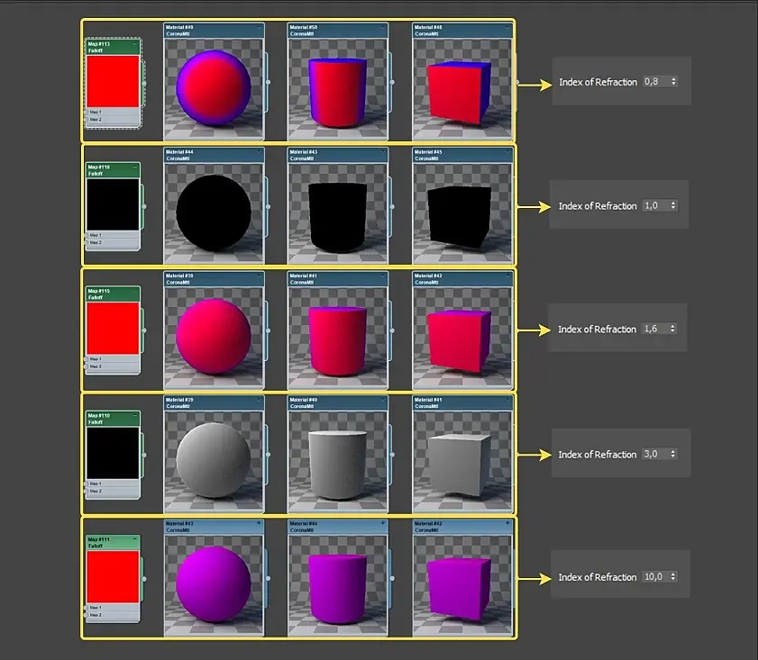 При значении 1.6 -3 - цвет Side еще создает контура.И при нарастающем увеличении параметров Index of Refraction - цвет SIde будет смешиваться с цветом Front, пока его на высоких значениях не поглотит.