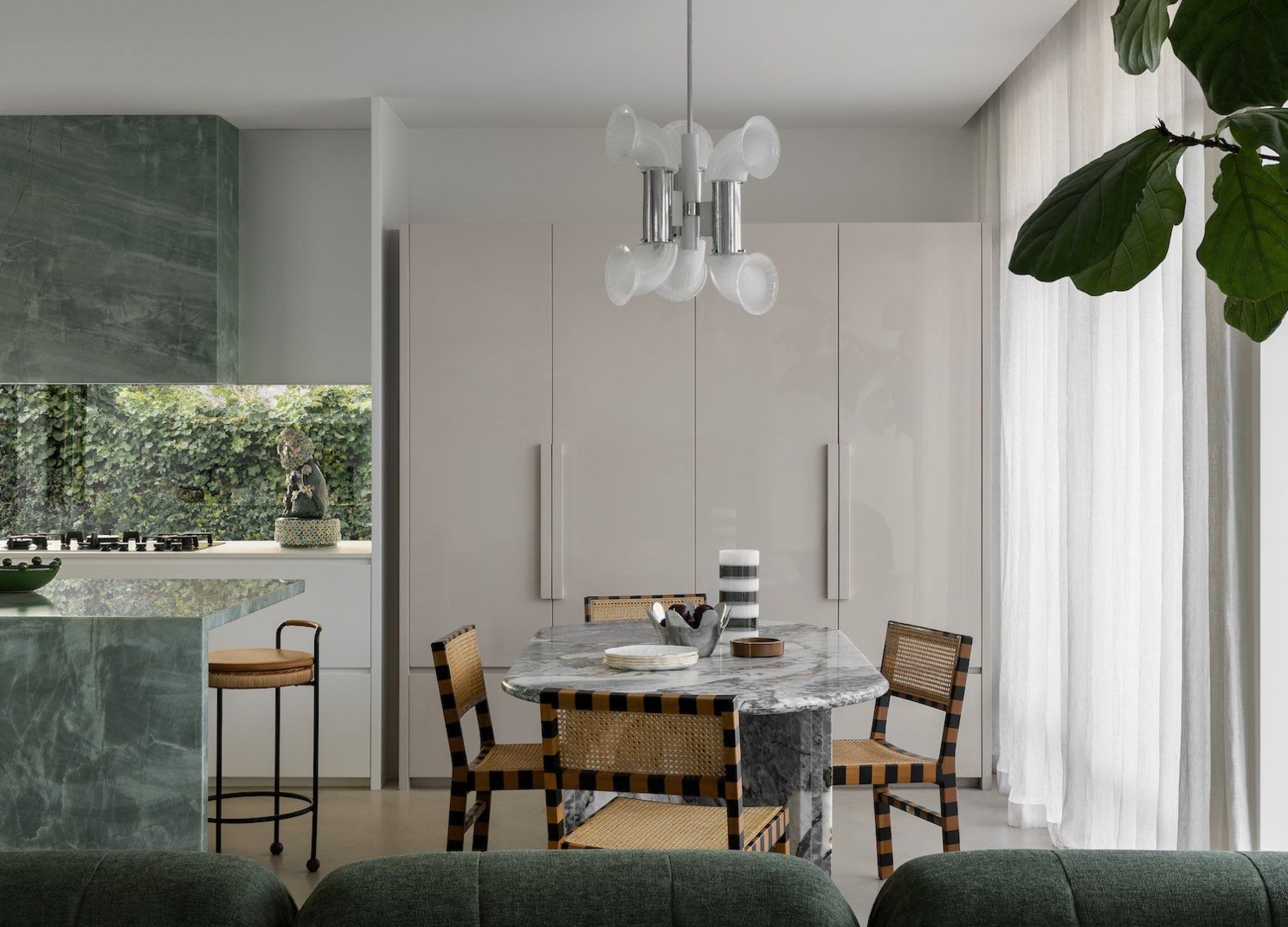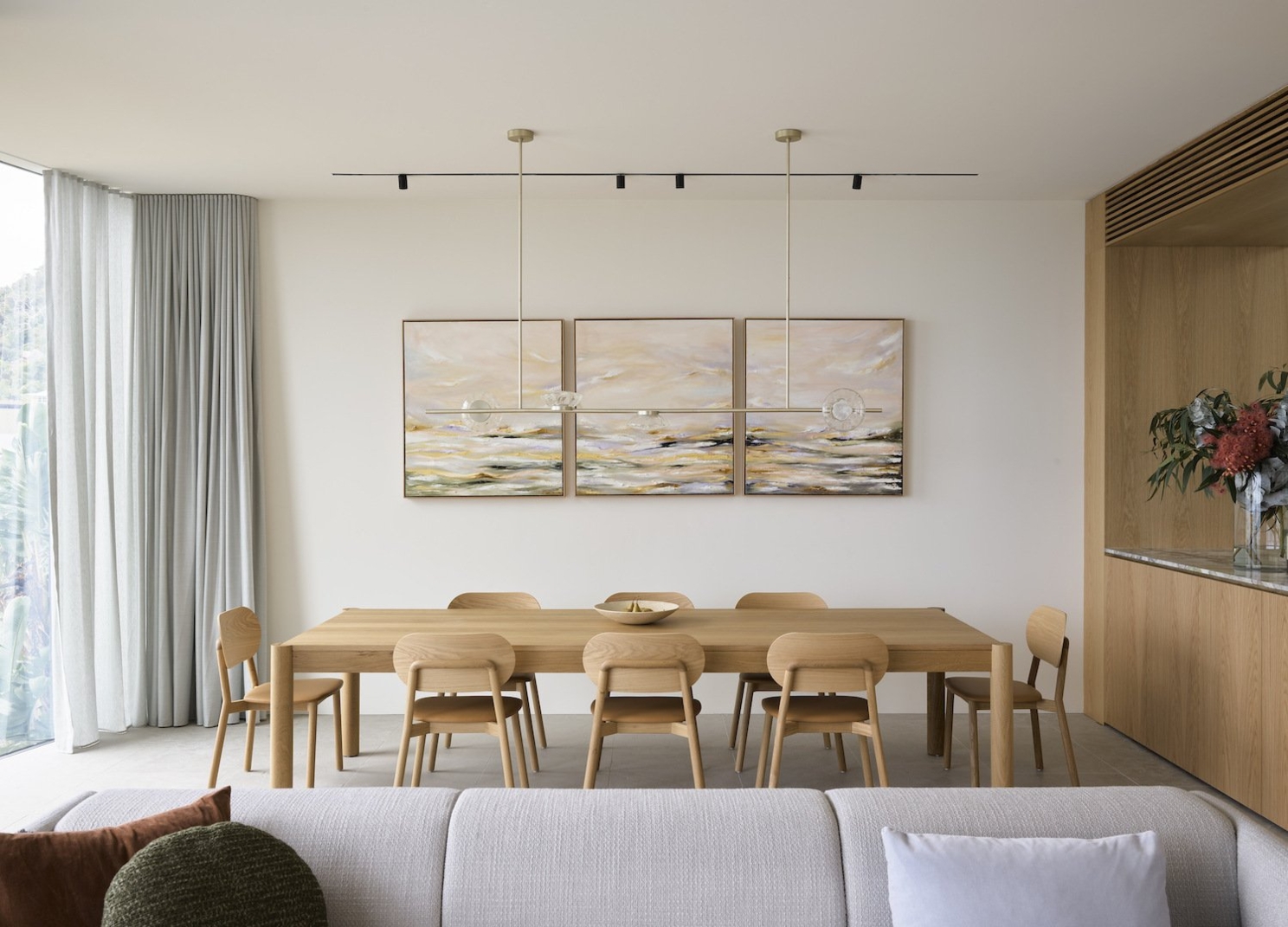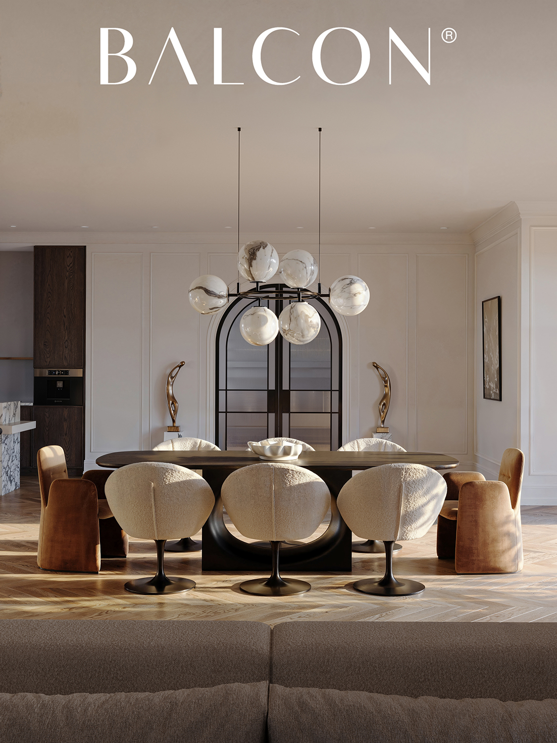 Было решено проработать обеденную группу. В ней есть интересные сочетания и формы, в качестве переднего плана будет выступать спинка дивана, причем мы намеренно сделали лесенку из подушек и спинки, чтобы взгляду было удобно подниматься по ней вглубь кадра.