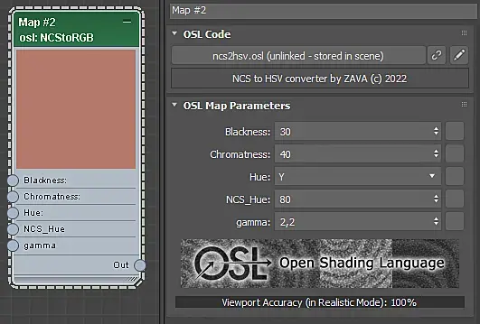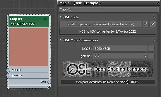 NCS же в отличии от RAL - это цветовая модель. Существуют здоровые печатные каталоги NCS, где как и в RAL, за сложной маркировкой кроется конкретный цвет. Однако можно заключить, что раз мы имеем дело с моделью, то можно сделать конвертер из одной цветовой модели в другую. Что я и попытался сделать средствами OSL в 3dsMax. По идее, с небольшой доработкой, скрипт должен завестись во всех пакетах понимающих OSL.