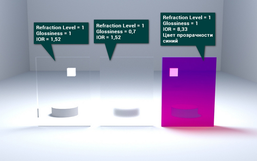 - Refraction добавляет объекту прозрачности. Изменяя этот параметр, можно создать стекла.Прозрачные объекты сложнее рендерить.