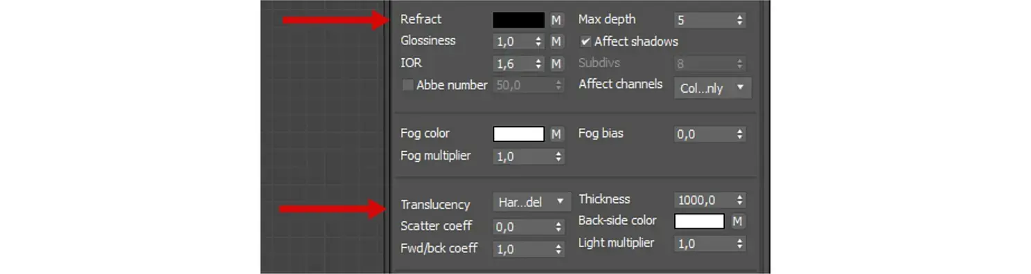 К нему можно подключать цветные карты Scatter color, SSS, которые определяют цвет "внутренностей" материала. В VRayMtl данные карты будут работать только при "включенных" опциях Refract и Translucency. Сама карта, подключенная к слоту Tranclucency, будет обозначаться как Back-side color.