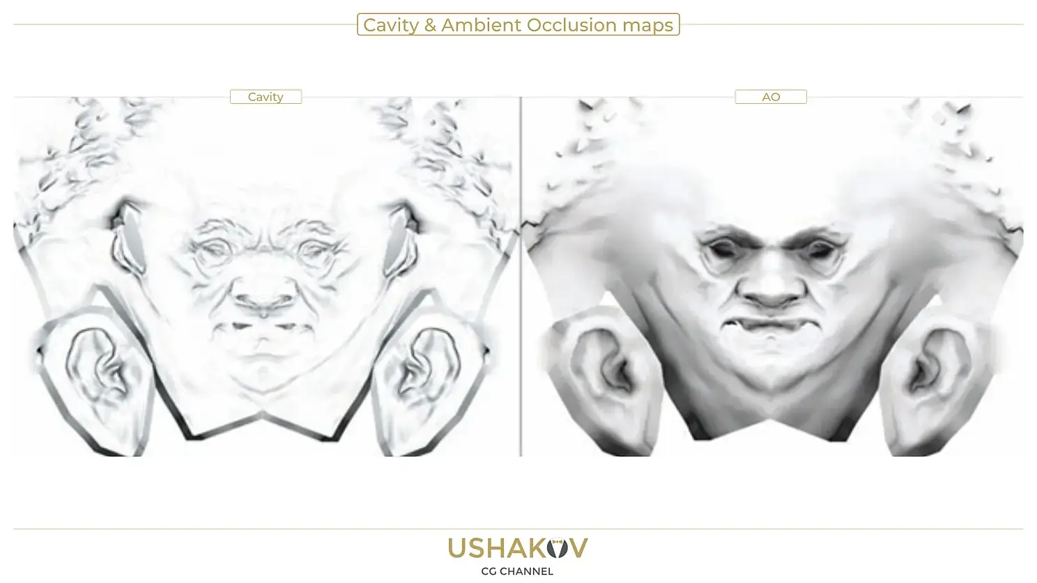 Отличие текстурных карт Cavity и Ambient Oclusion состоит в том, что Cavity "работает" на мелкую детализацию - трещинки, морщинки, углубления и прочие дефекты поверхности, а Ambient Oclusion работает на выявление и подчеркивания объема у небольших деталей, которые при расчете GI могут "потеряться" в общем объеме. Обе эти карты можно использовать одновременно или по отдельности, замешав их с основной диффузной картой через ноду Composite в режиме Multiply, а контрастность контролировать через непрозрачность слоя.