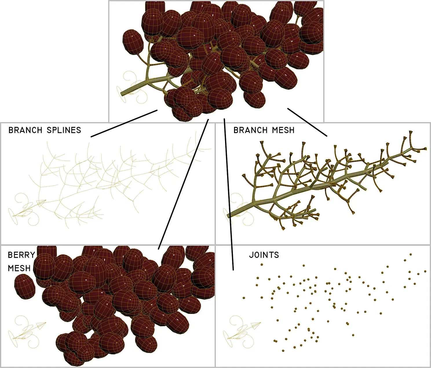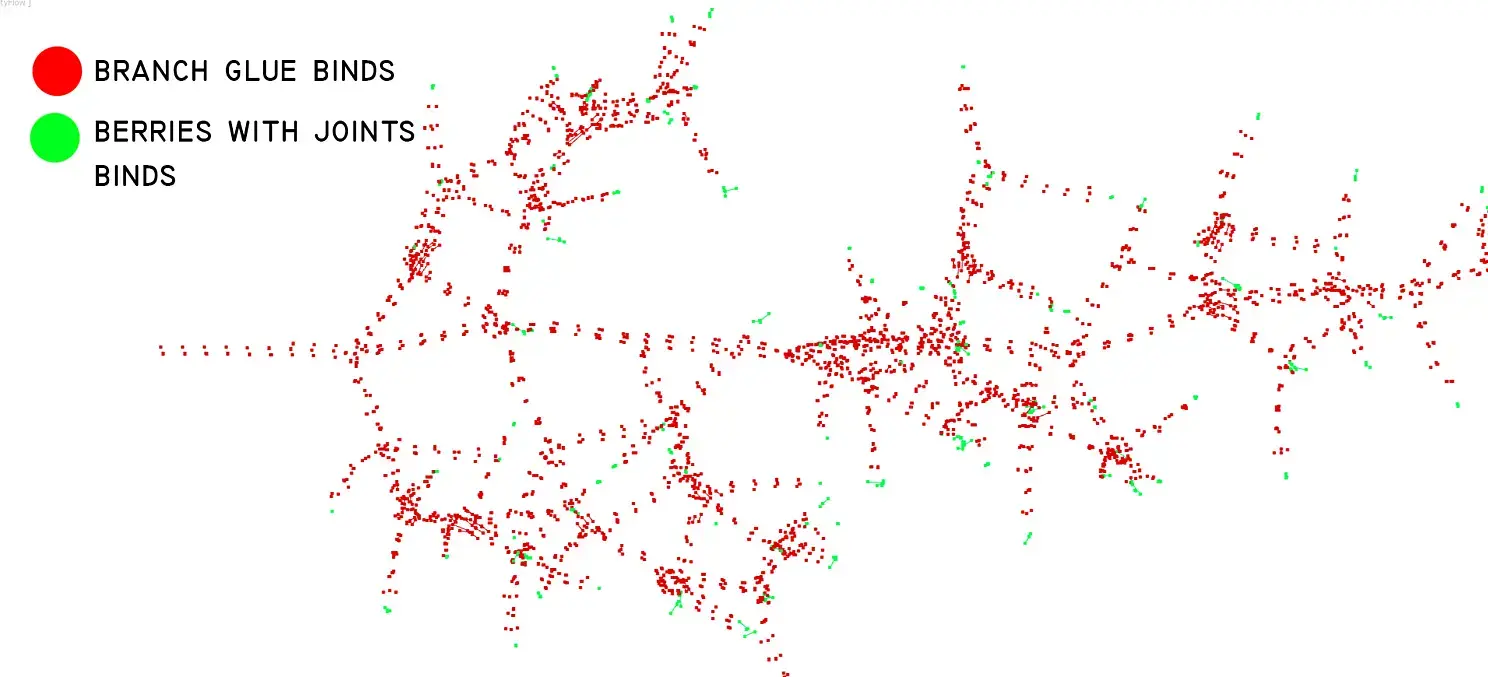 -Джоинты, для корректного присоединения ягод к веткам в tyflow. Это просто маленькие лоуполи сферы. Генерируются у основания ягод.