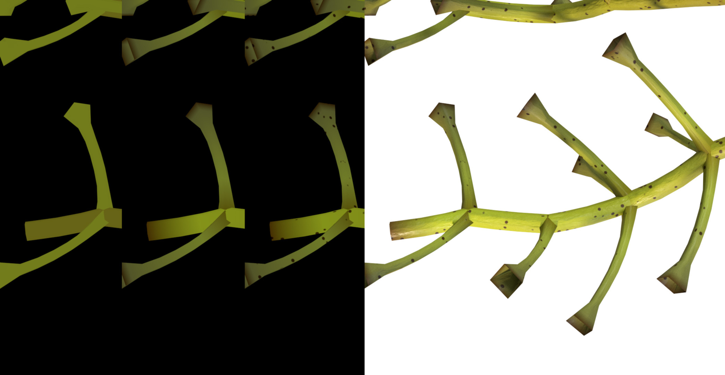 В общем-то с формой на этом этапе всё, можно конечно почистить видимые коллизии, а они есть, т.к. для упрощения симуляции ветка и ягоды не взаимодействуют друг с другом. Но какая же это процедурность, если руками что-то ковырять)) Лучше потратить время на создание материала.
