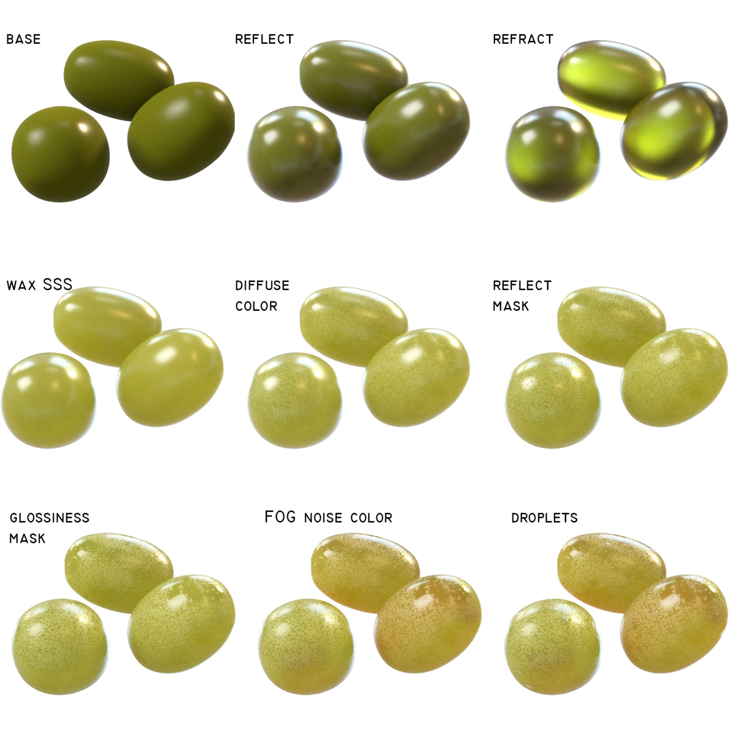 В материале исходная маска в режиме Instance разведена по различным картам Mix, в них маска не используется напрямую, везде свое подрезание по светлым и темным участкам. Параметров там немало, так что конкретные цифры при желании можно изучить в готовой модели . Также для цветового разнообразия в слоте Fog Color применяется крупный шум с редкими включениями цвета, слегка отличного от основного. И как /вишенка на торте/ капелька на винограде, поверх основного материала добавил мелкие капельки воды, крупнее не получится в рамках плоского материала. Опять маска, но на этот раз Cellular, она немного затемняет подложку и проявляет блик поверх ягоды (VrayBlendMaterial-additive mode) и дает имитацию объема этому блику.