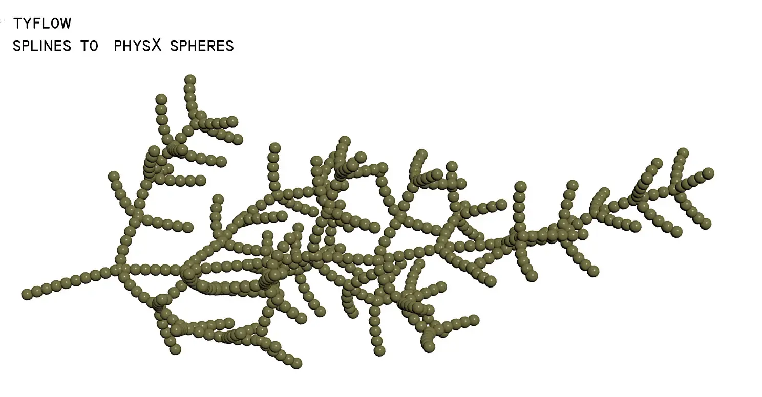 С помощью модификатора tyParticleSkin мы натягиваем этот меш на PhysX шарики, опять же разделение на группы позволяет игнорировать остальные детали из симуляции. Эти детали мы лучше вытащим с помощью tymesher.