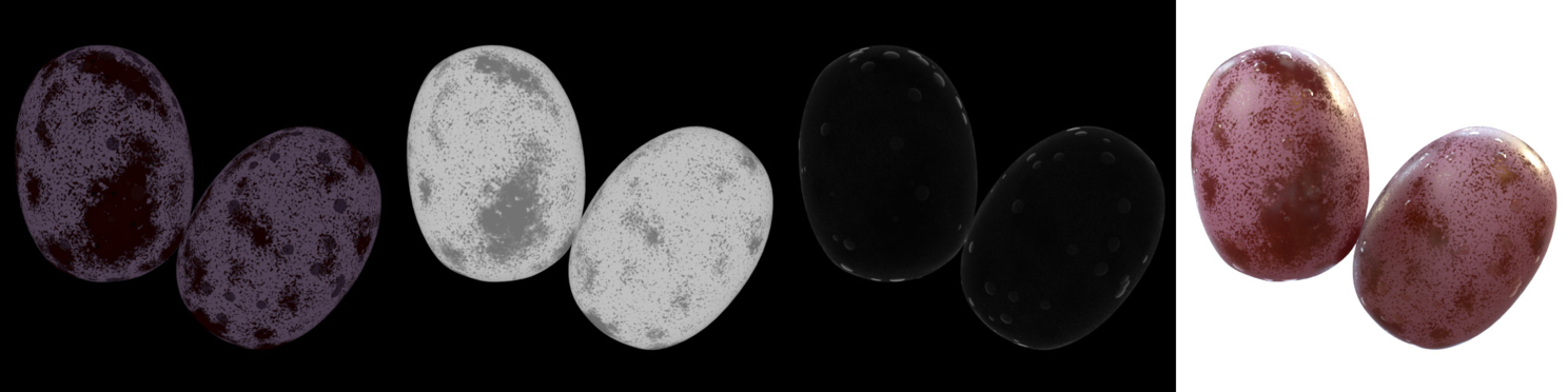 Материал также процедурный, не используется готовых растровых текстур. По сути он состоит из стандартного VrayMaterial с прозрачностью в режиме Hard (wax) и ЧБ маски, состоящей из шумов. Эта маска через Mix в разной степени влияет на диффузный цвет, отражающую способность и глянцевость, матовость в прозрачности. На отдельном крупном рендере маски можно разглядеть, что в шум впихнуты два шума помельче. На темных областях основного шума- это светлые частые пятна, на светлом- это редкие темные пятна.