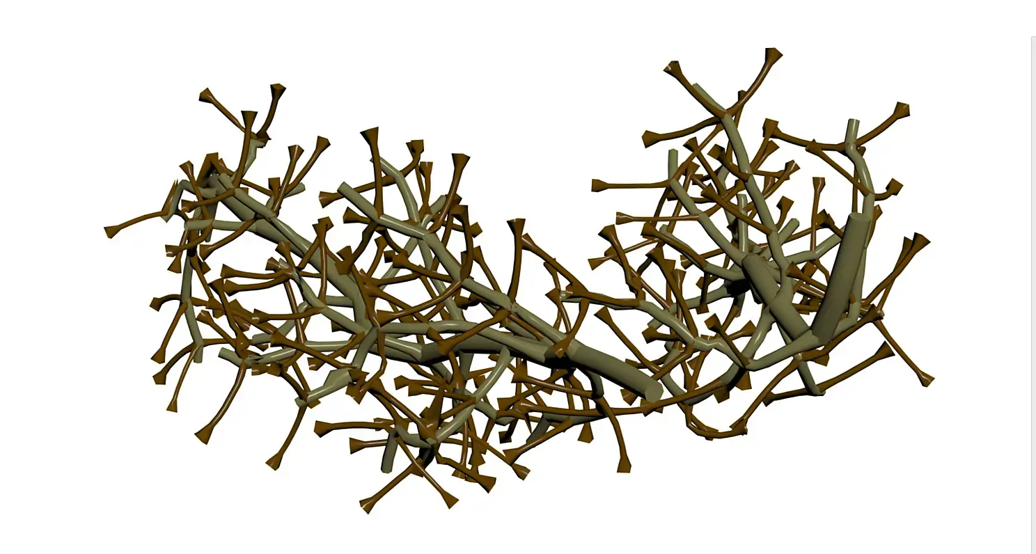 Итак, ветка лежит, но это месиво из шариков малопригодно для рендера. Придется восстанавливать геометрию, вспоминаем, что из GrowFX были утянуты не только сплайны, но и меш.