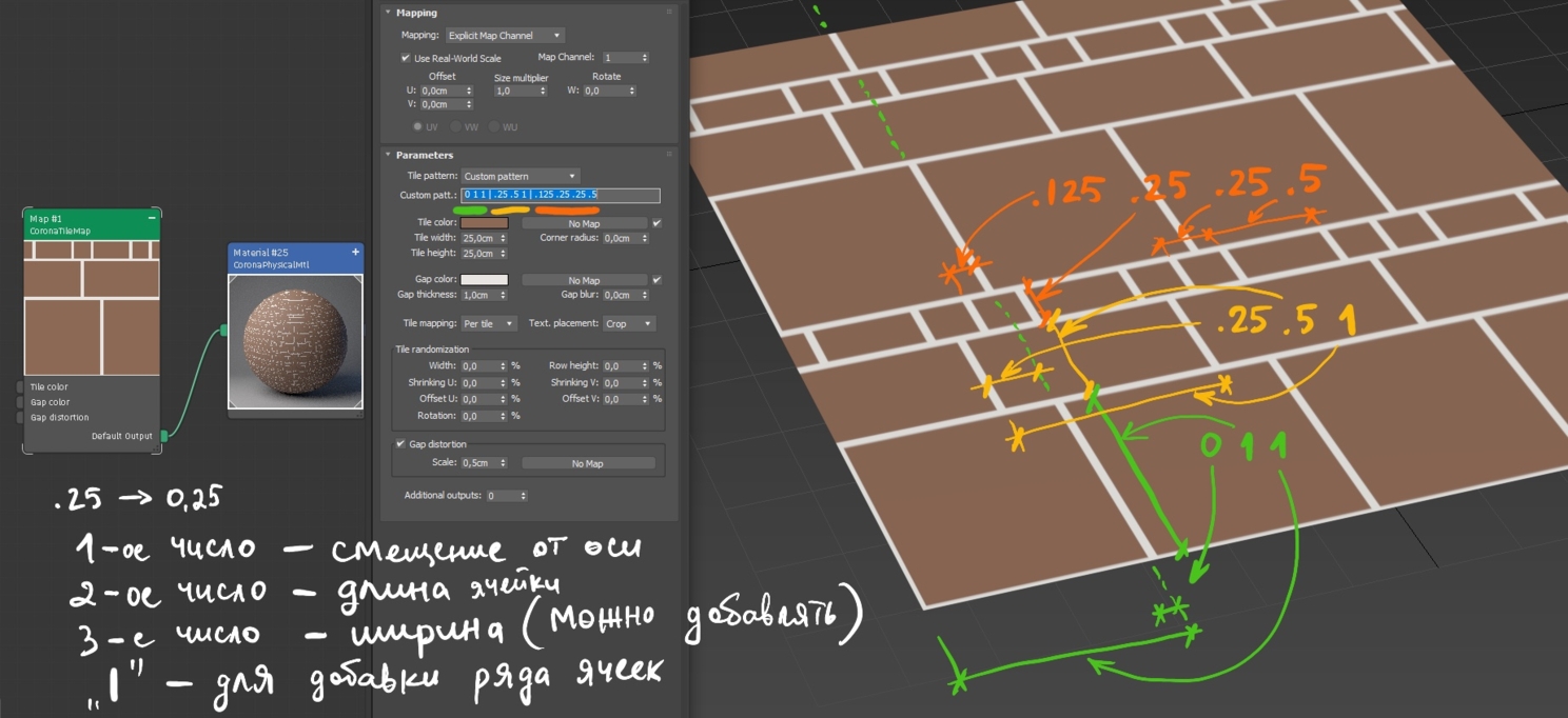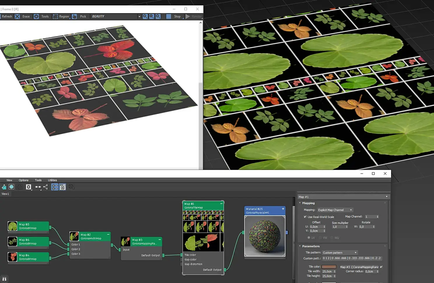 Ниже пример в связке с CoronaMappingRandomizer и CoronaMultiMap - рандом по текстуре, рандом по повороту, рандом по цвету, и добавлен ряд маленьких ячеек.
