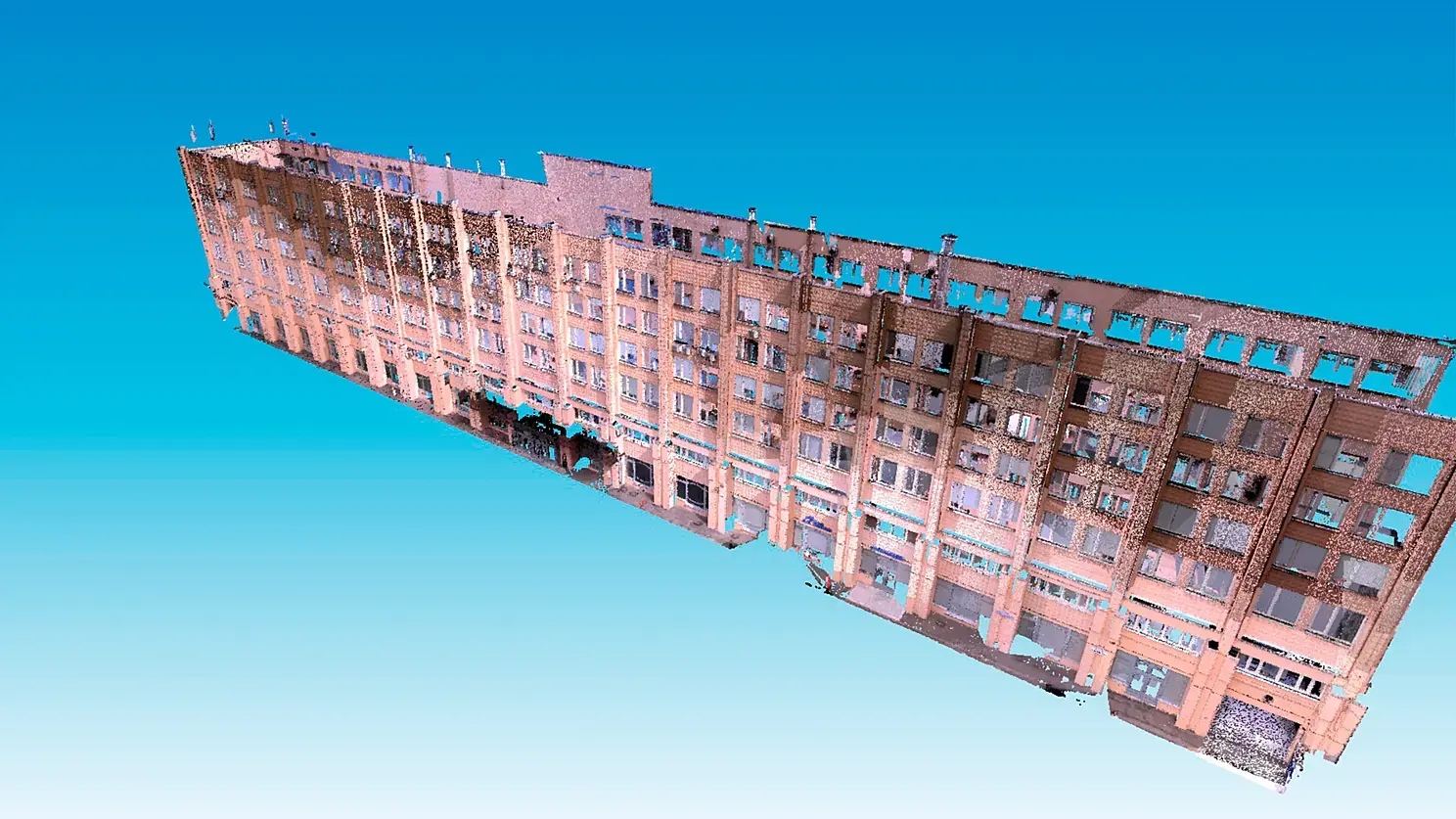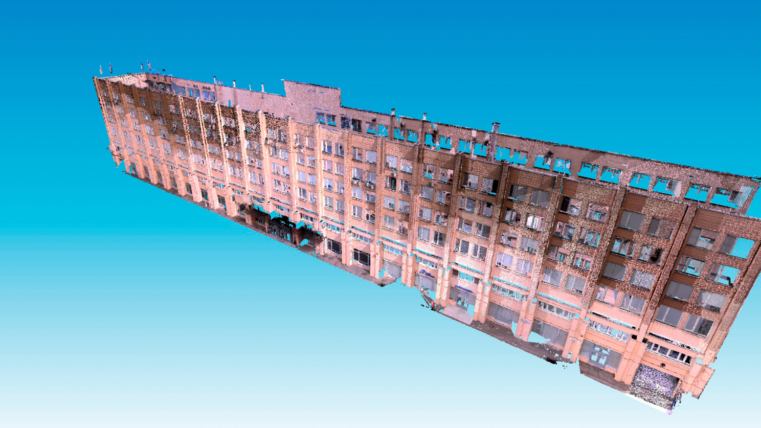 В связи с тем, что здание сканировалось разными приборами, в дальнейшем, при камеральной обработке данных, потребовалось объединить данные, чтобы создать единого «цифрового двойника». Соединять данные можно доверившись алгоритмам программного обеспечения, но … как говориться – доверяй, но проверяй! Вот как раз для этого мы и создали на первом этапе условную Систему Координат, которую «занесли» во внутрь здания, координируя специальные марки на каждом этаже Бизнес-Центра. Имея точные координаты марок, мы могли убедиться в том, что объединение данных сканирования внутри и снаружи прошло успешно! В итоге: глобальная погрешность сканирования (среднеквадратичное отклонение – СКО) составила меньше 5 сантиметров. А это всего лишь 0,05% от все длины здания!