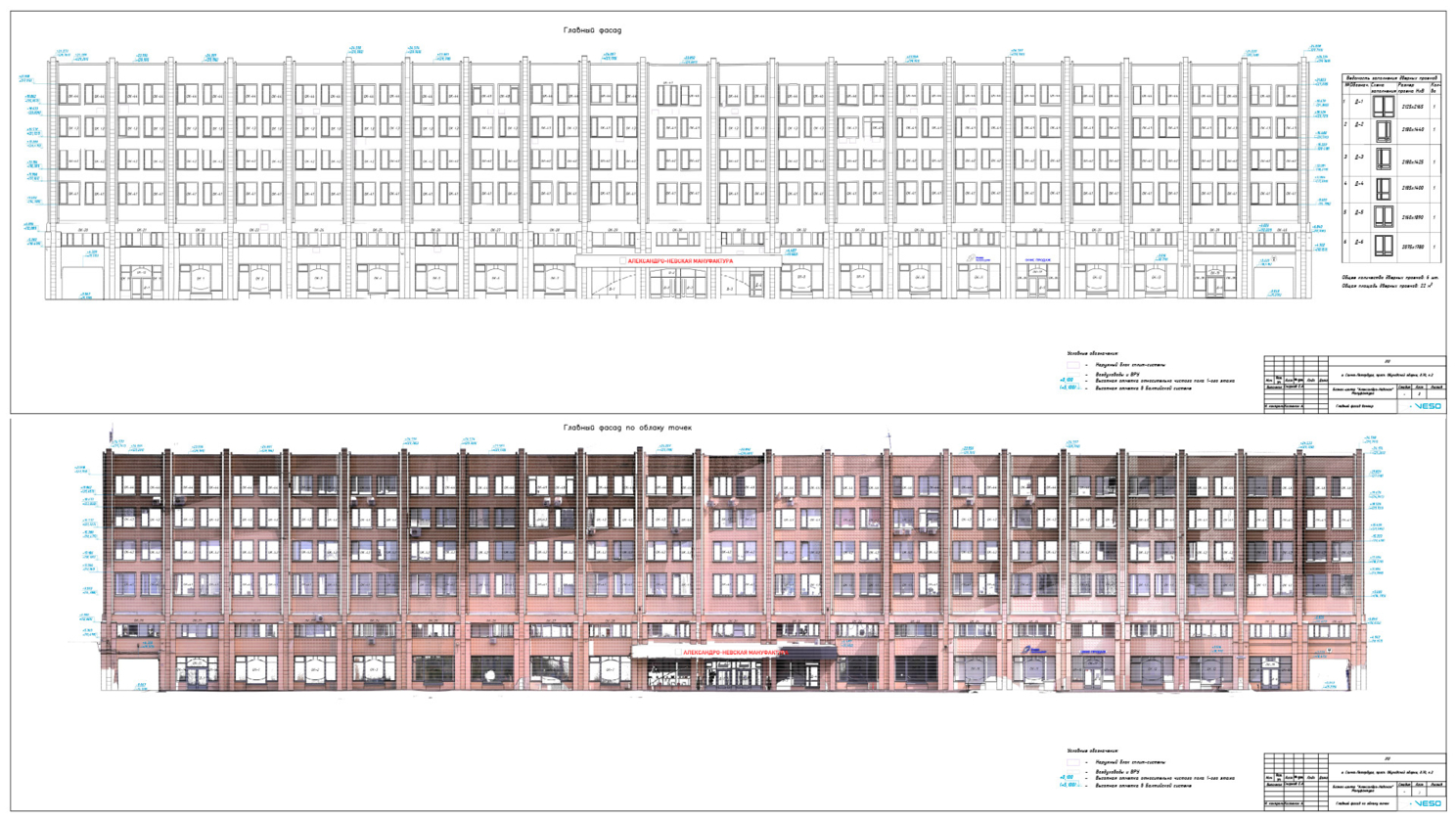 Благодаря высокой степени детализации модели, подготовка обмерных чертежей и формирование паспорта фасада заняло всего 1 день ! Несмотря на свою прогрессивность и явные преимущества, 3D-моделирование пока до конца не может заменить классические инструменты проектирования. Именно поэтому выпуск 2D чертежной документации всегда выполняется нашей организацией, в рамках контрактов на обмерные работы.
