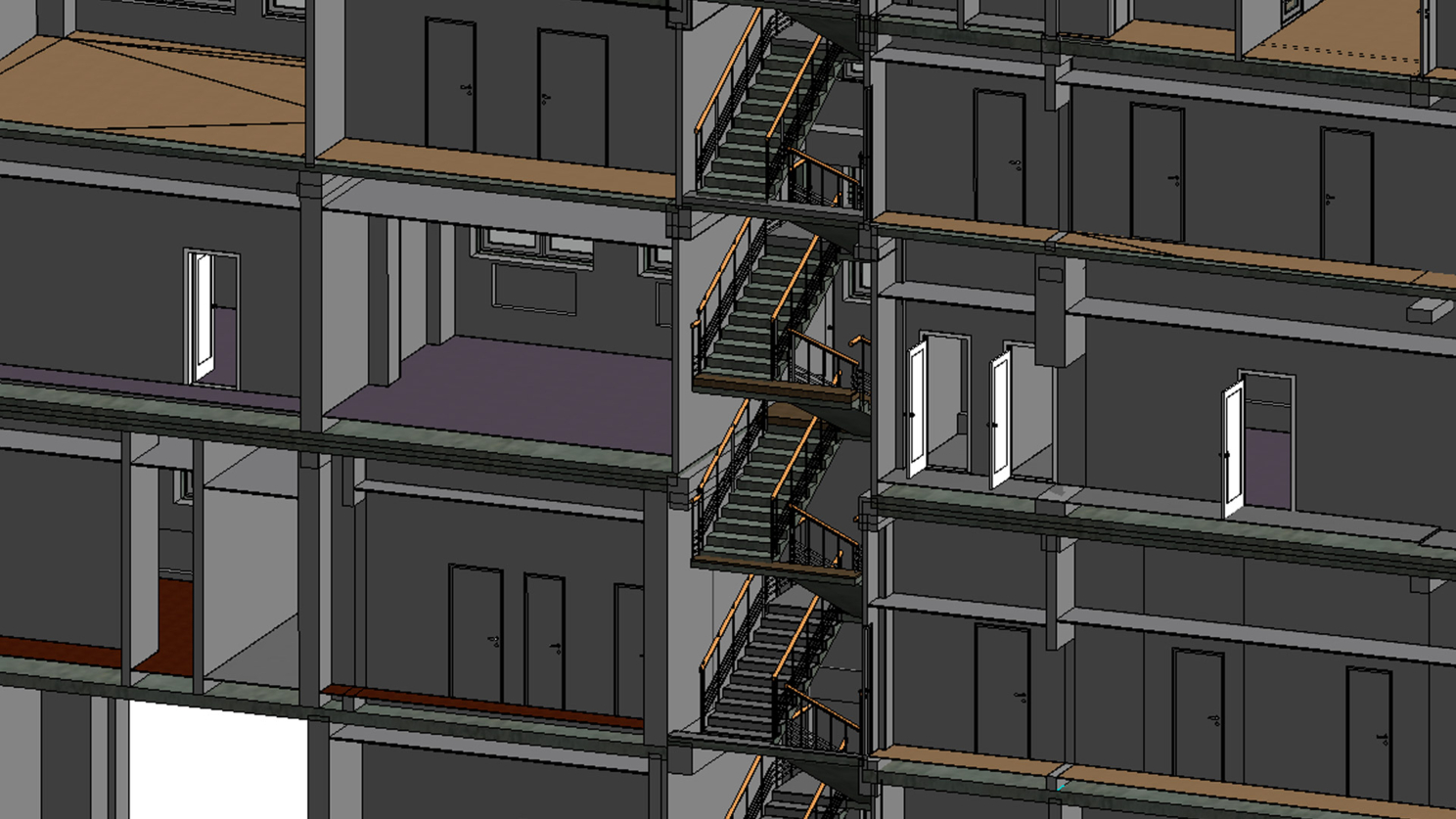 После получения сводного облака точек, его проверки и отчистке, команда VESO приступила к воссозданию модели здания в Revit. Работа выполнялась в единой модели параллельно несколькими инженерами, благодаря BIM360 этот процесс удобен и эффективен. После проверки на коллизии в Navisworks – модель разделами АР и КР была передана в архитектурно бюро для дальнейшего проектирования реконструкции. Детализация модели была различная: так фасады выполнены в высокой степени детализации LOD 300, а, например, офисные помещения, большая часть которых будет демонтирована, в LOD 200. Согласно технического задания на лазерное сканирование и 3D моделирование, была важно понять конструктивную схему здания и его возможные осадки, деформации, самовольные переустройства. Для этого в определенных местах были вскрыты потолки и отделка стен. Поэтому в сканирование попала не только финишная отделка, действующего бизнес-центра, но и важные блоки и узлы. Сканирование показало, что существует незначительная просадка здания (около 8 см), а также многочисленные перепланировки, которые неизбежно появляются во время жизнедеятельности любого объекта коммерческой недвижимости.