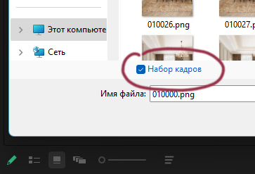 Перед тем как нажать кнопку "Открыть", нужно убедиться, что установлена галочка "Набор кадров".