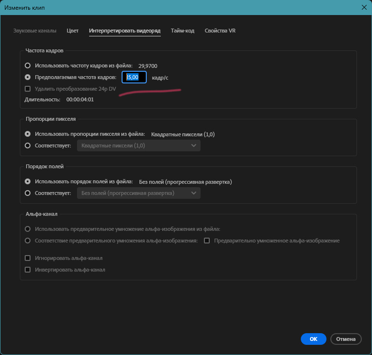 После того как вы выбрали исходный материал в левом верхнем углу у вас появится миниатюра вашего будущего видео. Щелкаем по нему правой кнопкой мыши и "Изменить" > "Интерпретировать видеоряд..."