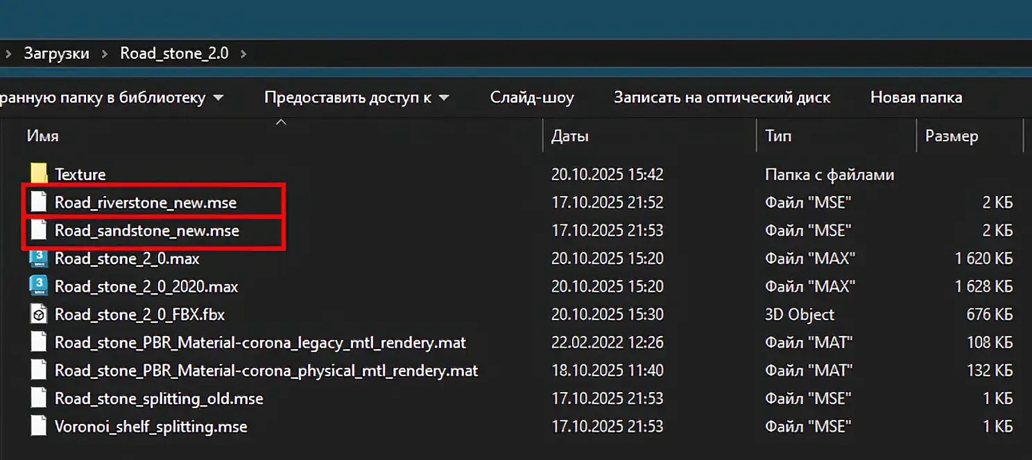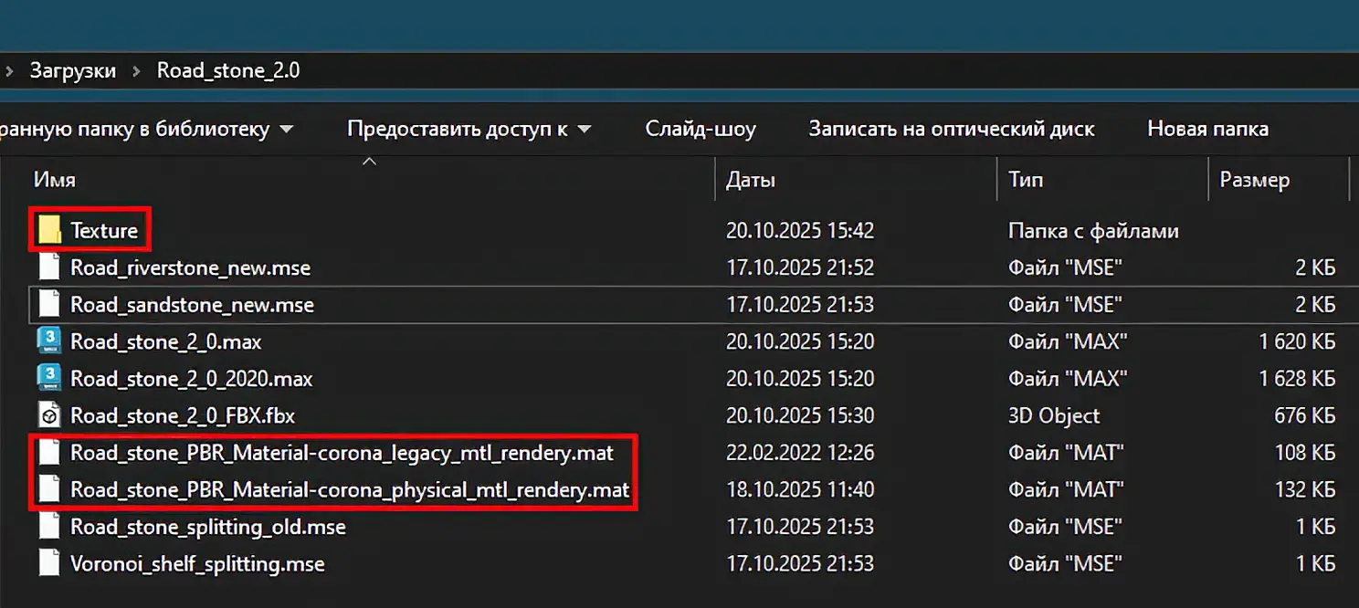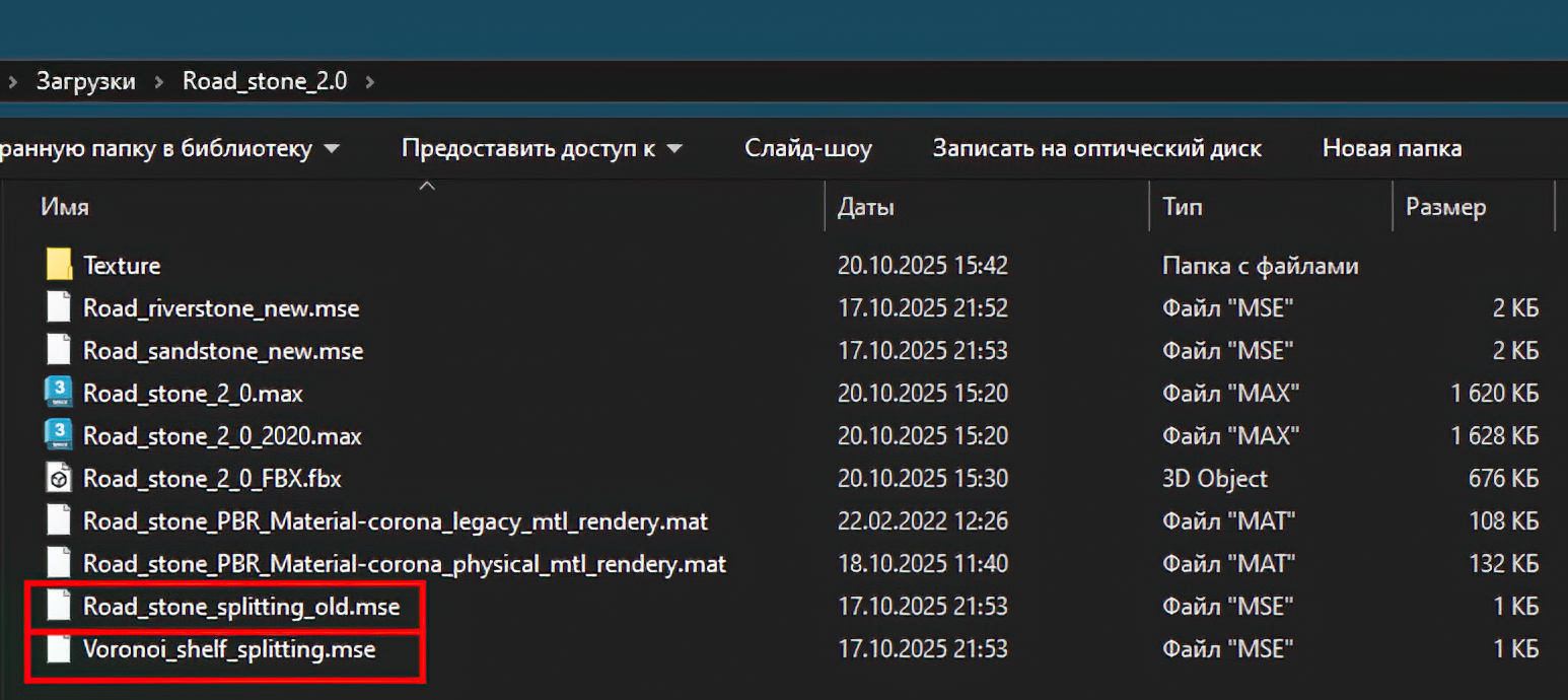 В папке со скриптами имеются библиотеки материалов и текстуры, настроенные для работы с Corona Render версий 3 - 11, которые можно загрузить к себе на диск и открыть в редакторе материалов из любого удобного места. Материалы там как для старой версии короны: Road stone PBR Material - corona legacy mtl rendery, так и для новой: Road stone PBR Material - corona physical mtl rendery. Все текстуры и материалы названы логическими названиями. Присутствуют материалы для морского и сланцевого камня, а также промежуточной засыпки мелкими камешками, если требуется.