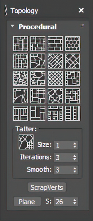 В первых версиях скрипта было недостаточно контроля за генерацией дорожек, чего очень не хватало. В связи с этой проблемой работу новой версии скрипта было решено разделить на два этапа. На первом этапе непосредственно происходит разбиение сплайновой геометрии на полигоны неправильной формы. Здесь есть два метода. Первый - это старый алгоритм 2022 года. В папке скрипта он именуется Road_stone_splitting_old.mse. Он сохранен для большей вариативности и энтузиастов-любителей предыдущей версии скрипта. Второй - это алгоритм по методу "мозаики Вороного" (файл: Voronoi_shelf_splitting.mse). При его применении появляется всплывающее окно 3ds max "Topology", в котором можно выбрать варианты разбивки сетки по мини-схемам на кнопках.
