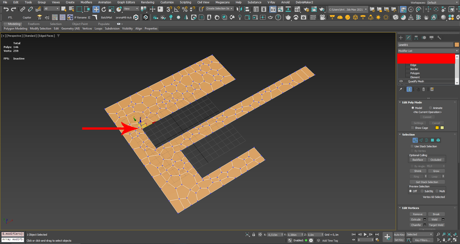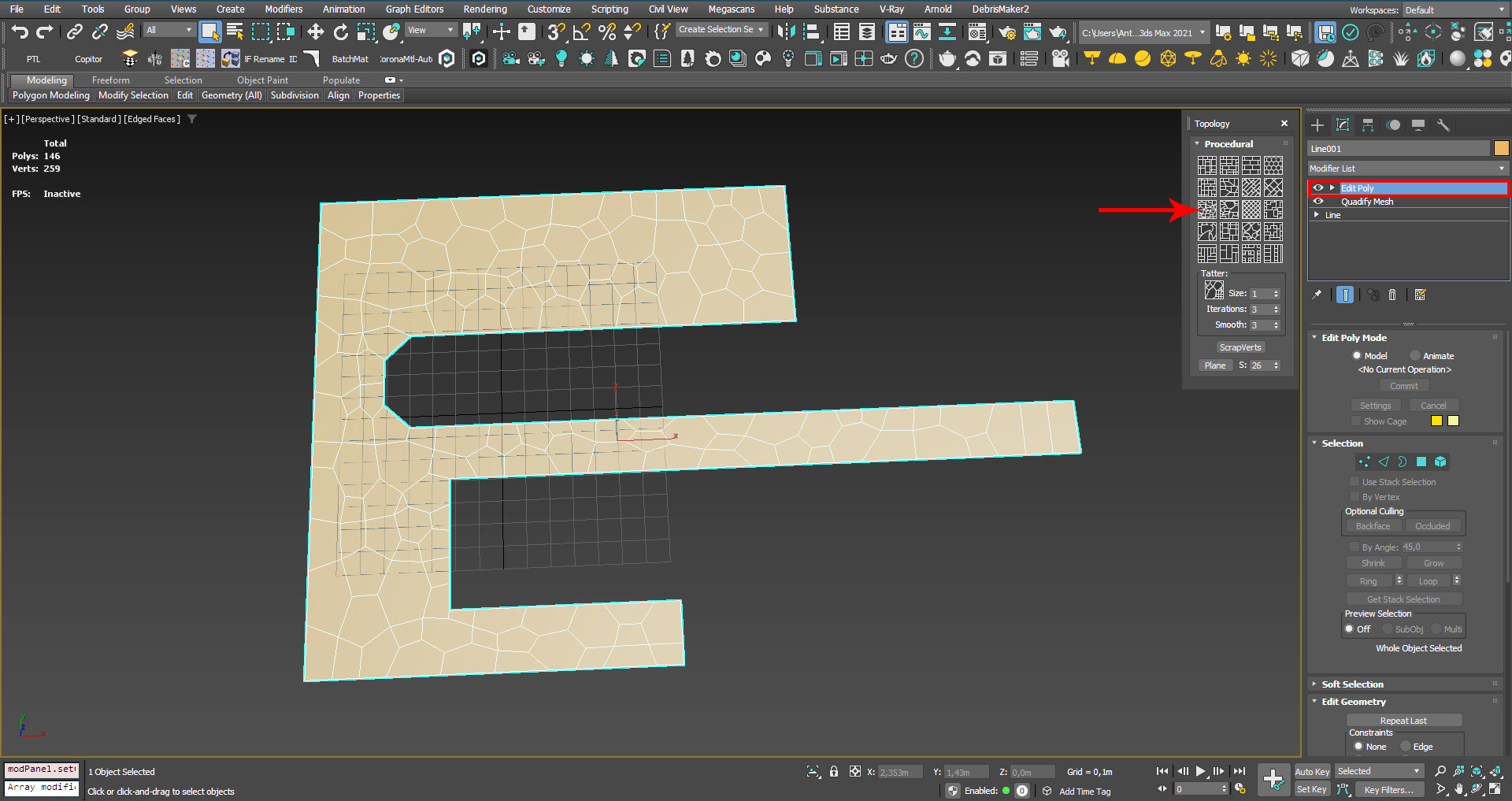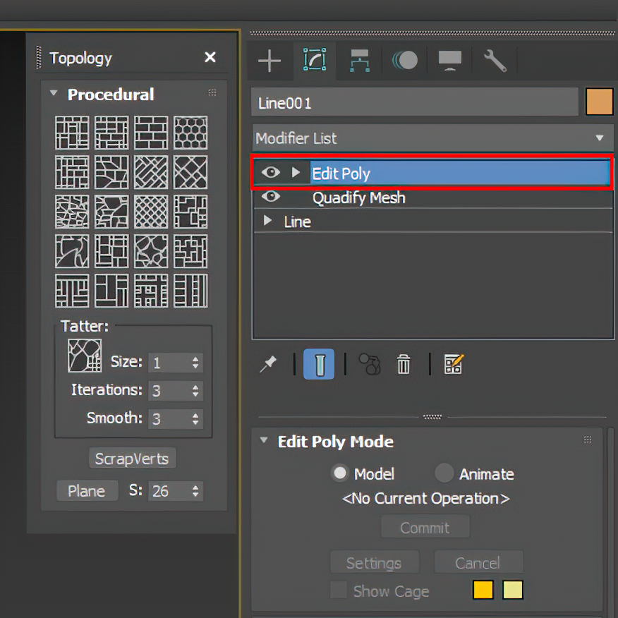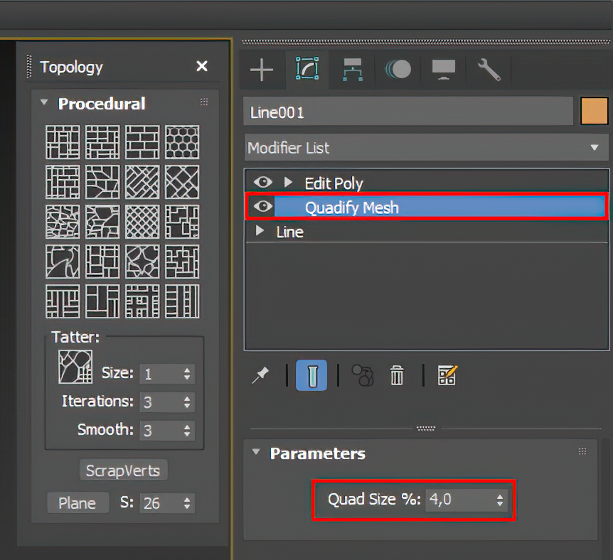 Чтобы выбор скрипта по методике Вороного сработал, у вас в сетке модификаторов, должен быть выбран Edit Pоly в верху сетки. Перед применением этого метода в сетке модификаторов нужно перейти в модификатор Quadify Mesh и настроить процент разбиения сетки в параметре Quad Size. Чем меньше процент разбиения, тем плотнее разбита сетка. Чем выше плотность сетки на этом этапе, тем меньше будут полигоны-кирпичики после применения скрипта. Таким образом мы регулируем масштаб наших камней.