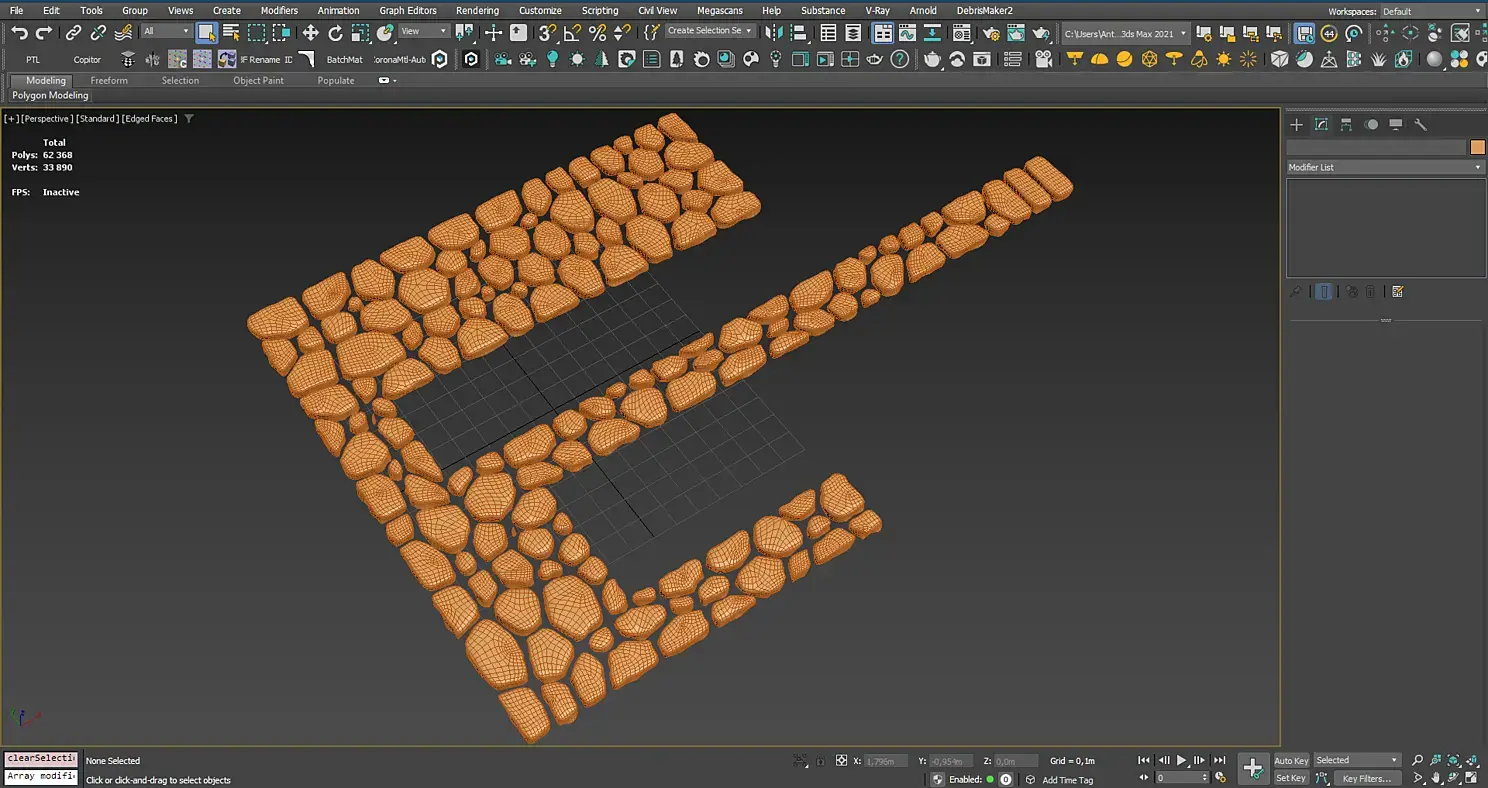 В результате применения этих скриптов плоская сетка преобразуется в объемные камешки и сетку Editable Poly с наложенным сверху модификатором Turbo Smooth, который можно регулировать для ближних и дальних ракурсов и других ситуаций.