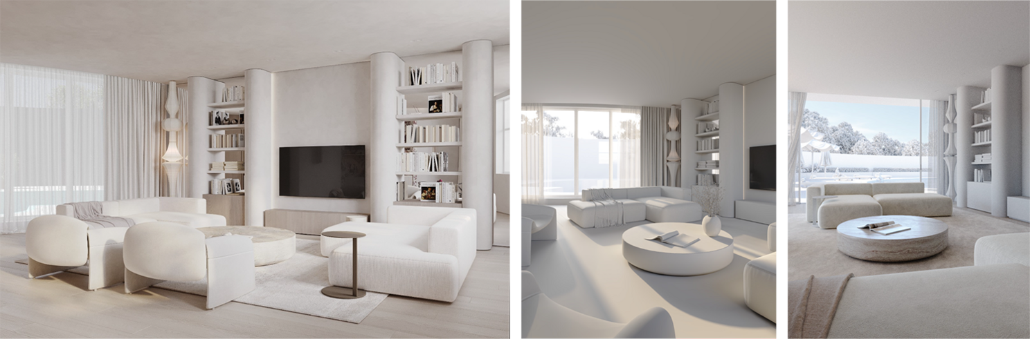 Например, оттенки деревьев с небом практически получилось повторить с правого нижнего рефа; холодный рефлекс от неба на журнальном столике из травертина подглядел из верхнего правого референса — ну и далее по списку. Также передний план увели в тень по сравнению со остальными планами, тем самым добились большей глубины.