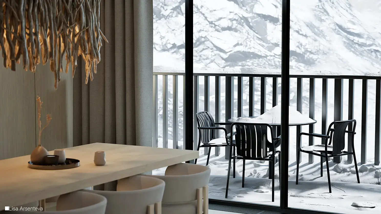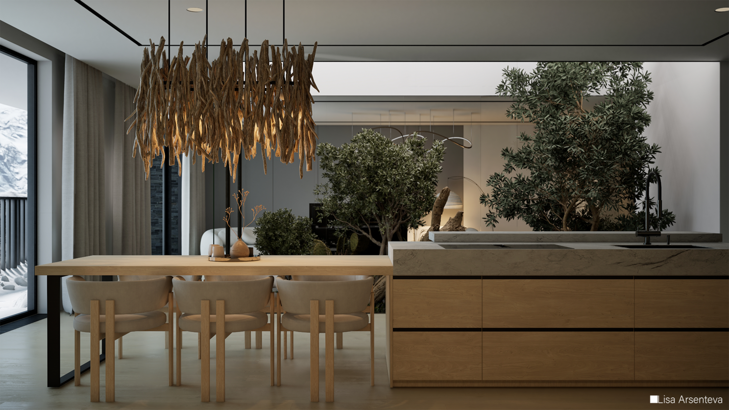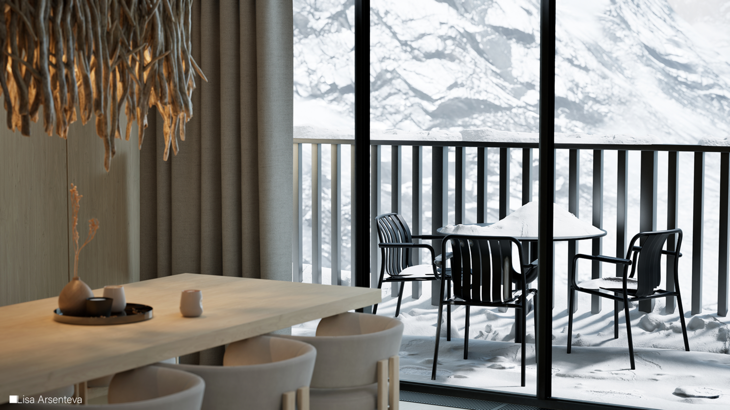 Всегда в работе хочется добавить смысл и из-за этого проект долго просто лежал. Потому что просто сделать интерьер с растениями внутри - ну такое. Тогда я случайно наткнулась на фотографии из Розы Хутор и поняла, что мне нужен именно зимний пейзаж за окном. Создается контраст между теплым и уютным интерьером и ледяными горами за окном.