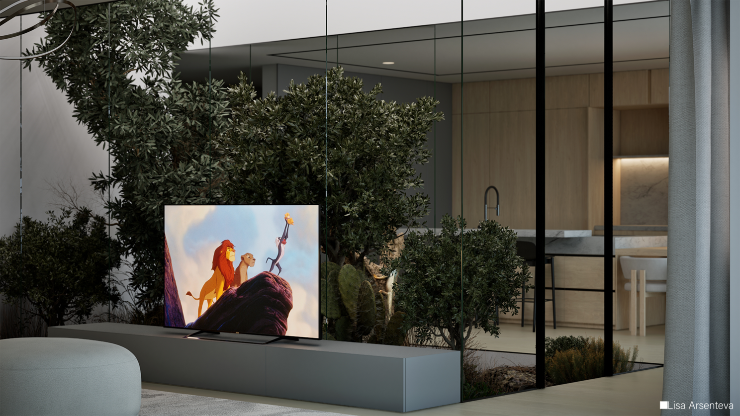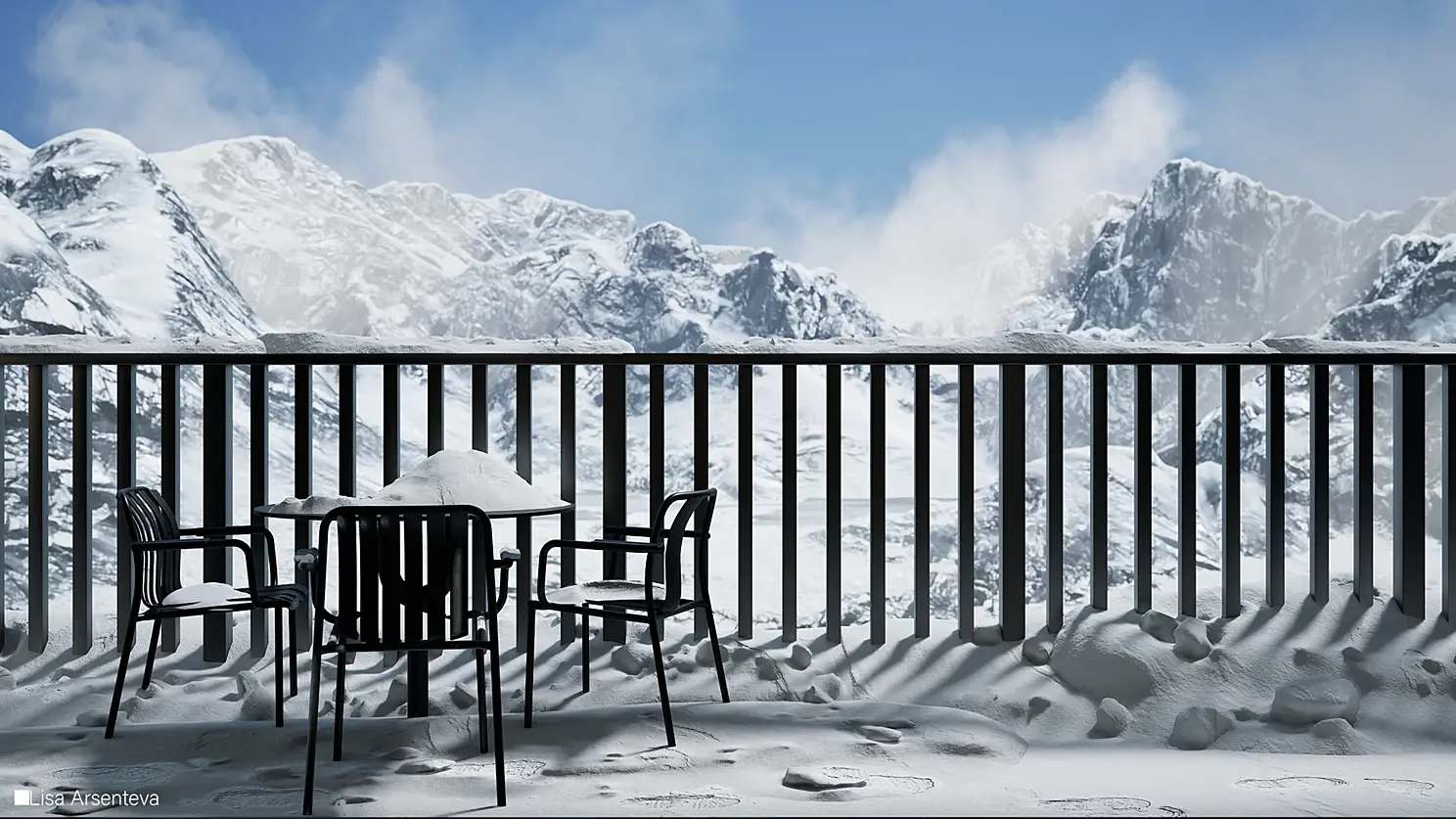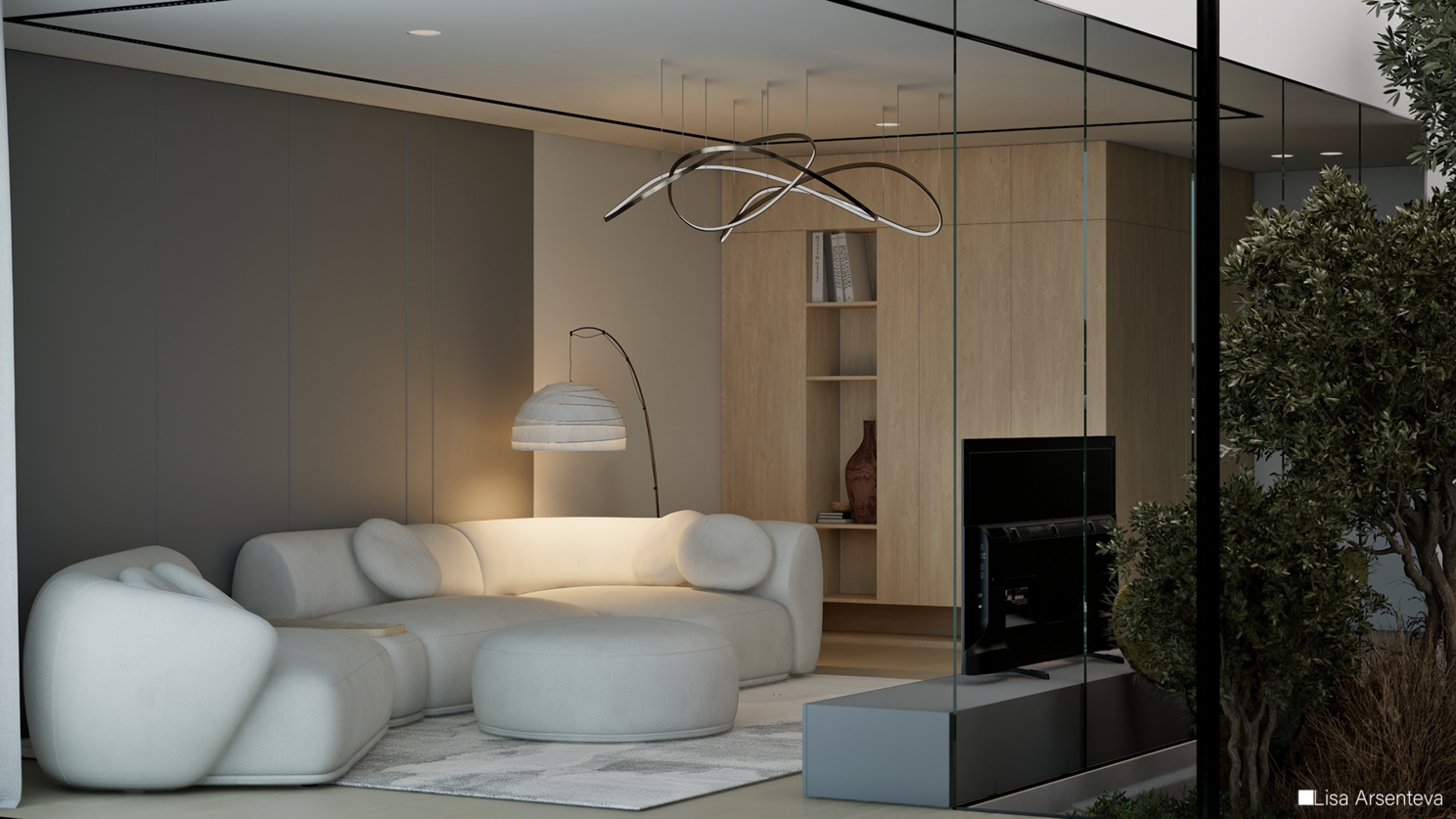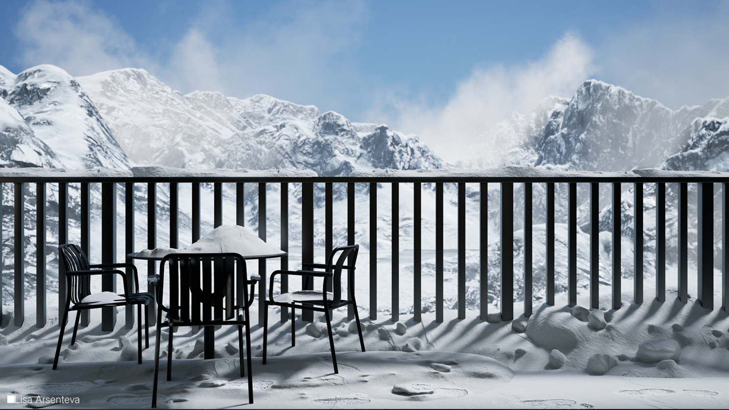 Всегда в работе хочется добавить смысл и из-за этого проект долго просто лежал. Потому что просто сделать интерьер с растениями внутри - ну такое. Тогда я случайно наткнулась на фотографии из Розы Хутор и поняла, что мне нужен именно зимний пейзаж за окном. Создается контраст между теплым и уютным интерьером и ледяными горами за окном.