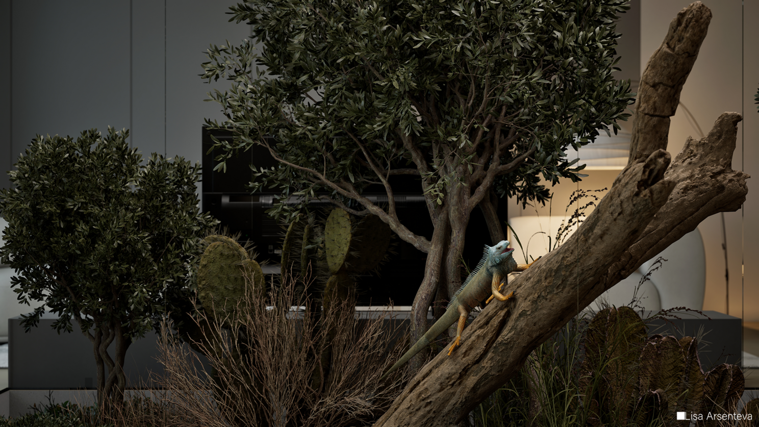 В процессе работы я долго подбирала освещение, меняла мебель и декор, довольно долго возилась с игуаной.