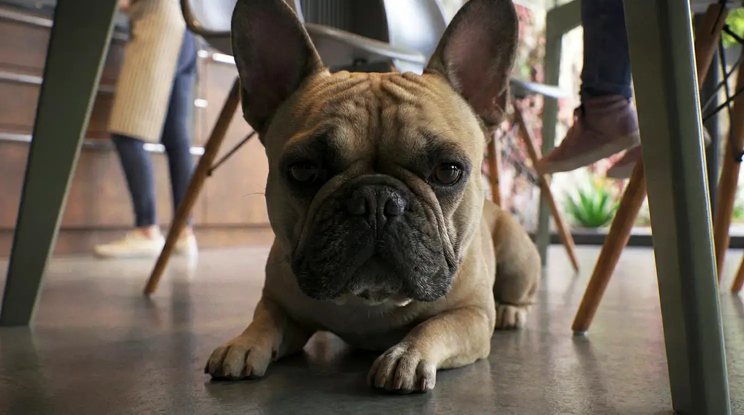 Покажи ракурс на собаку крупным планом, сохрани пропорции стола и стульев сделать 16:9. Второе уточнение в том же чате на смену ракурса: Сделай более крупный план на собаку