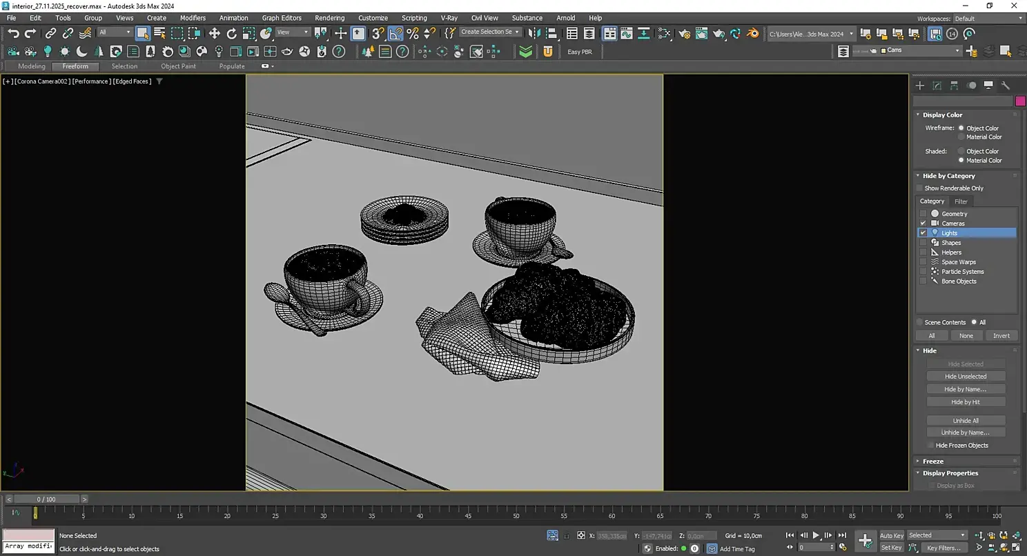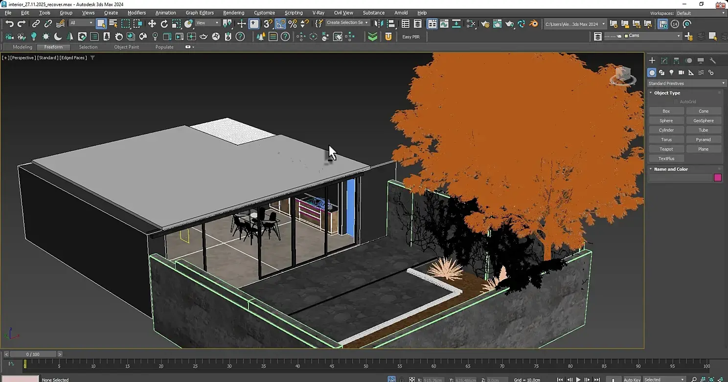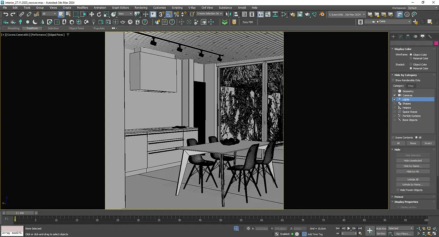 Проект изначально собирался в 3ds Max + Corona Renderer. Сцена представляет собой смешанный интерьер и экстерьер с большим остеклением.