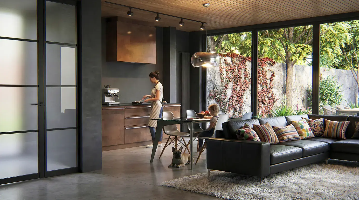 Промпт: добавить красивую женщину которая готовит на кухне у плиты, слева добавить кофе-машину, на столешнице за столом сидит ребёнок и рисуетю Рядом лежит собачка маленькая и отдыхает. Над столом лампа подвес бионической формы серебристого цвета, лампа светит на стол тёплым приятным светом, за окном улучшить растительность сделать красивый сад и бассейн (Примечание: от идеи с бассейном за окном в итоге было решено отказаться, оставив фокус на интерьере).