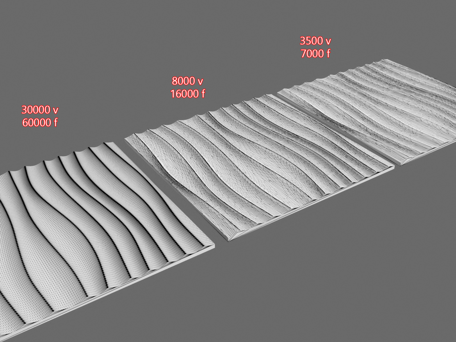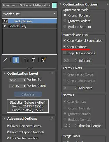 Что-бы получить такой эффект я использовал модификатор ProOptimizer. Постепенно уменьшая значение процентов и контролируя результат останавливаемся на определенном значении. Что-бы не слетели координаты текстур нужно поставить галочку Keep Textures.