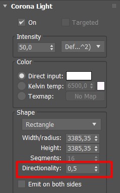 Какие же конкретные значения Directionality нужно устанавливать в CoronaLight, чтобы источник света (далее ИС) был направленным или рассеянным?