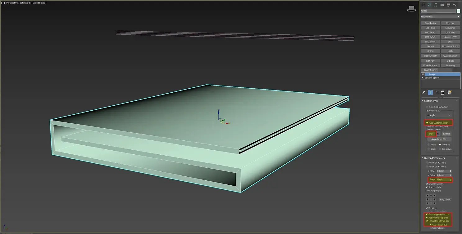 Как сплайны будут готовы, отключите толщину линий, она нам не понадобится. Выберем линию Width и применим к ней модификатор Sweep, в котором нажмем Use Custom Section - Pick и укажем линию Length. При необходимости повернем сечение на нужный угол, и обязательно сгенерируем координаты развертки в Real World Scale, т.к. помним, что симуляцию ткани мы делаем в CLO и импортируем в нее ткань, сгенерированную на основе грамотной развертки. Галочка Real World Scale делает развертку непотянутой.