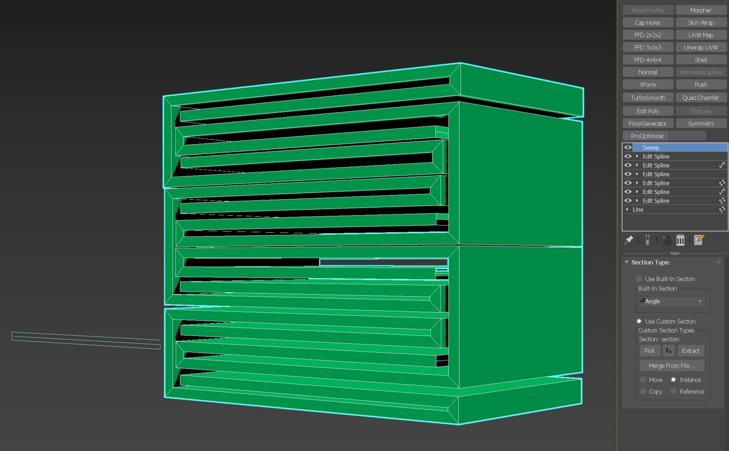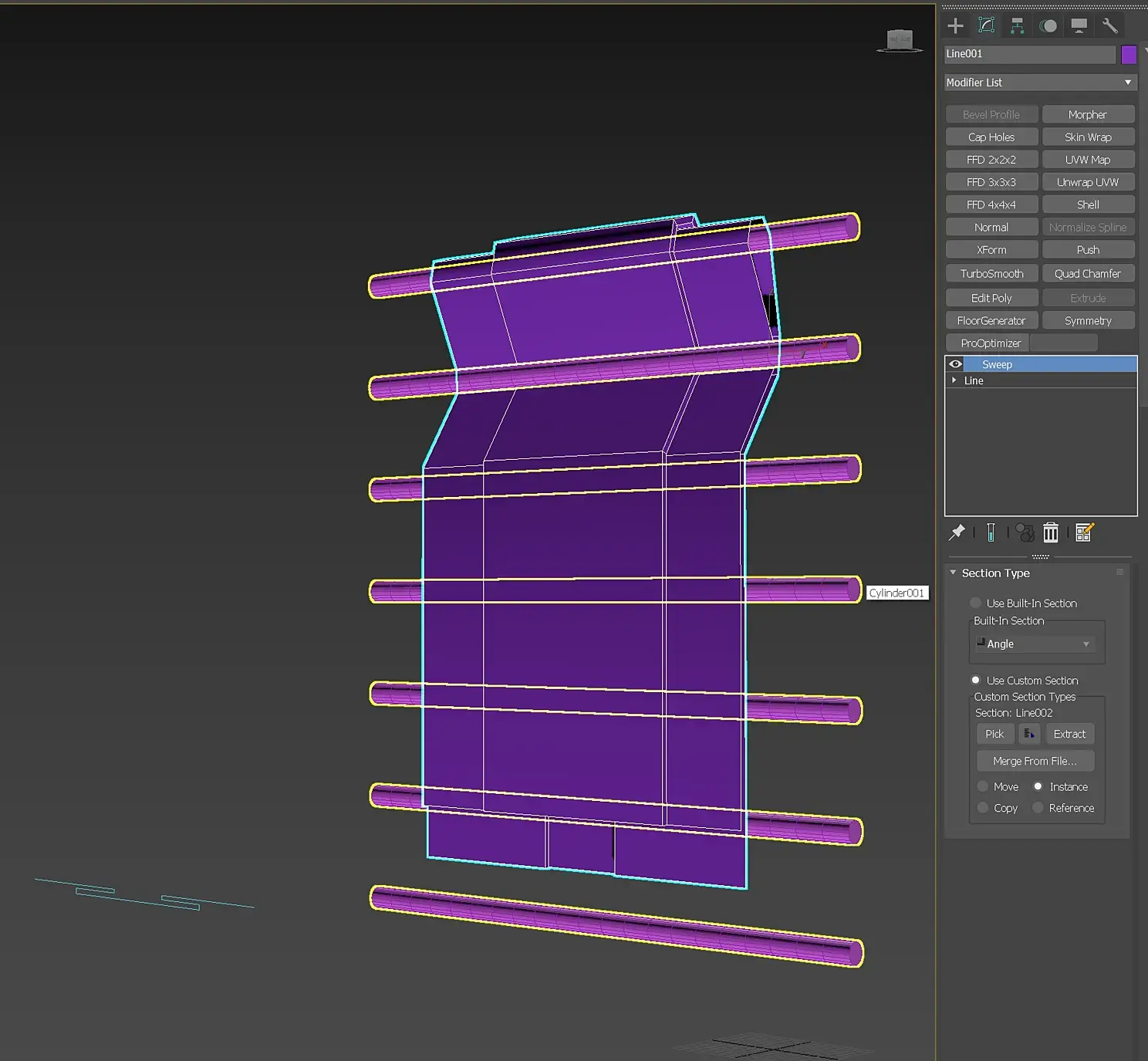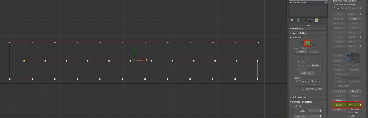Удалим модификатор Sweep. Линию с шестью сегментами закрутить не получится, поэтому зайдем на уровень сегментов, выделим все горизонтальные и разделим их 10-ю вершинами.