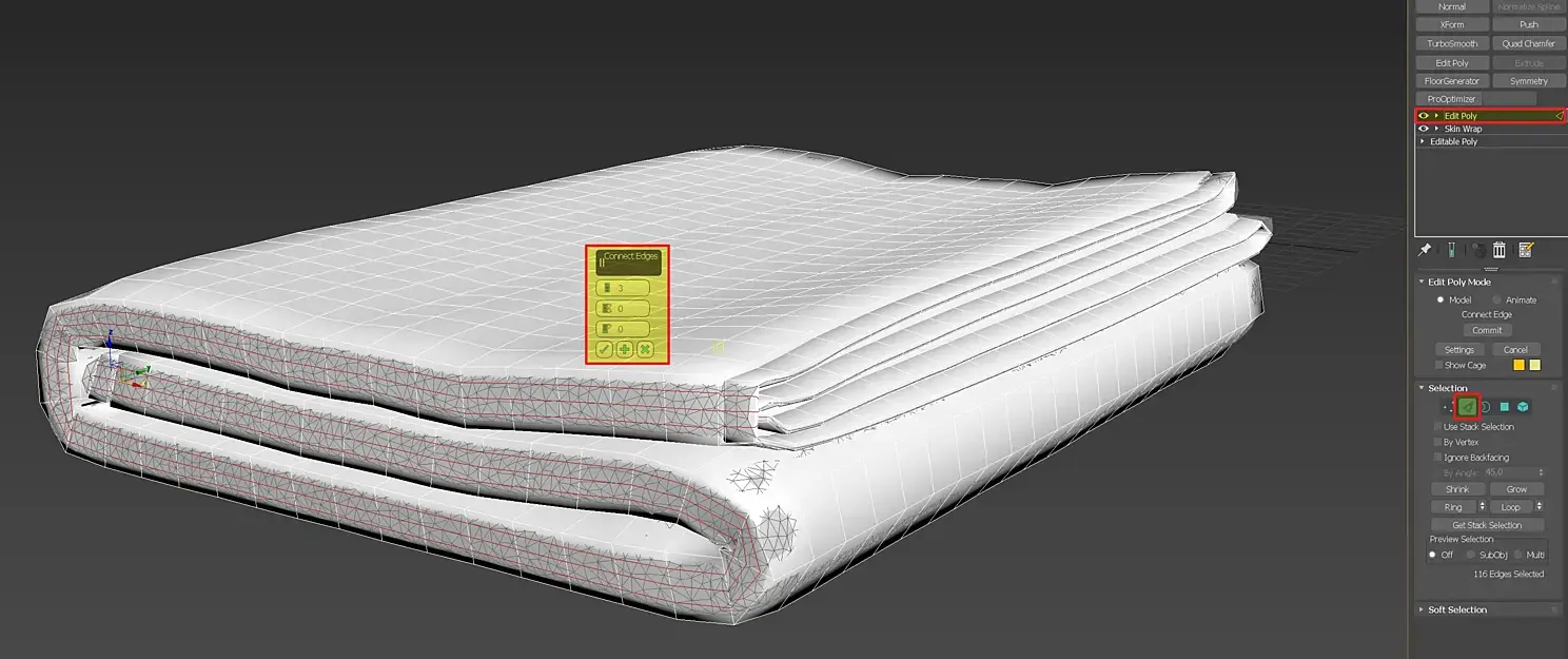 Видим, что в местах сгибов недостаточно плотная сетка. Сверху модификатора Skin Wrap накинем Edit Poly и дорежем ребра, где это необходимо.