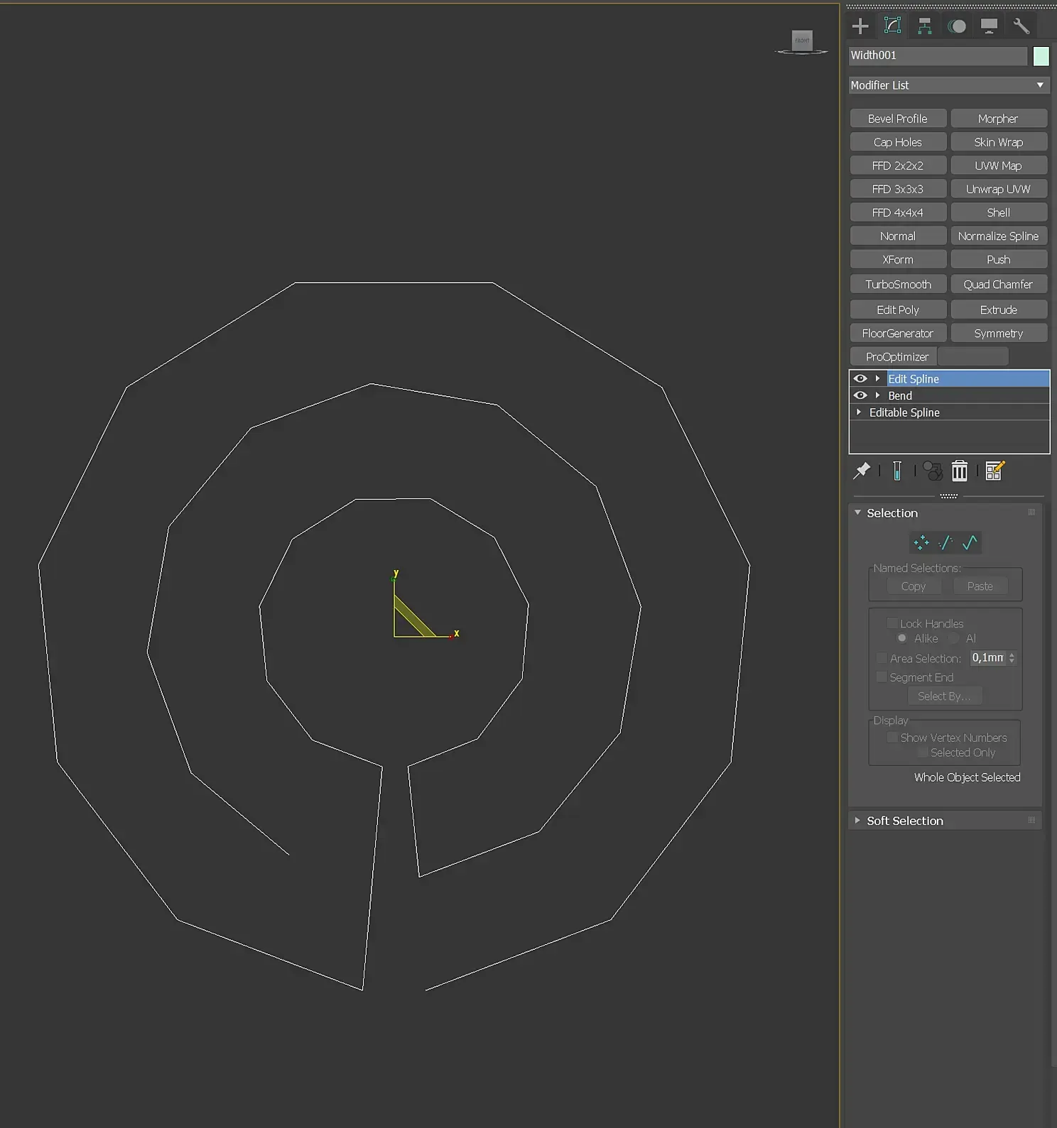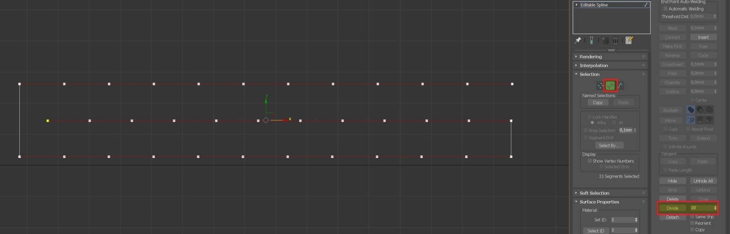 Посмотрим размеры сплайна и, если он меньше, чем 500 мм, накинем сверху стека модификаторов Edit Spline и отмасштабируем его.