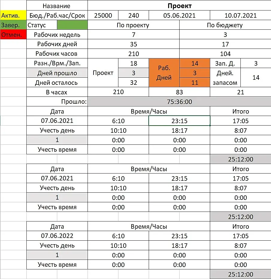 Эта таблица только по бюджету, стоимости работы за час и срокам заказчика на выполнения проекта, делает все просчеты. Если сделать себе нечто подобное, то по ней можно узнать количество времени, отведенное по проекту, фактическое время, которое надо будет на него потратить, учет запаса времени и сколько времени уже прошло, сколько осталось. То есть, для себя я понимаю, какое количество времени проект у меня займет и сопоставляю эту цифру с цифрой из таблицы, если моя личная цифра равна или меньше цифры из таблицы, я берусь за обработку заказчика для получения проекта. Это позволяет довольно быстро ориентироваться в привлекательности тех или иных работ. Причем, часто проекты долгострои стоят дешевле, чем остальные из-за больших дат. Эта табличка мне позволяет брать такие проекты и считать полезное время, забивая этими проектами промежутки времени, между активными проектами, когда заказчик собирает тз, делает правки, прописывает изменения или порой просто приходится ждать информацию от каких-то бригады, для дальнейшей работы. И я могу не сидеть, прочесывая себе плешь на затылке или ковыряя в носу вавку, а воспользоваться этим временем максимально эффективно. Надеюсь, этот пример будет для вас полезен и информативен. Такая табличка делается в несколько шагов, сначала верхняя часть которую заполняем, потом первые просчеты (из дат, бюджета и времени) – общее количество времени, затем более детальное, рабочее количество времени и суммы этих чисел.