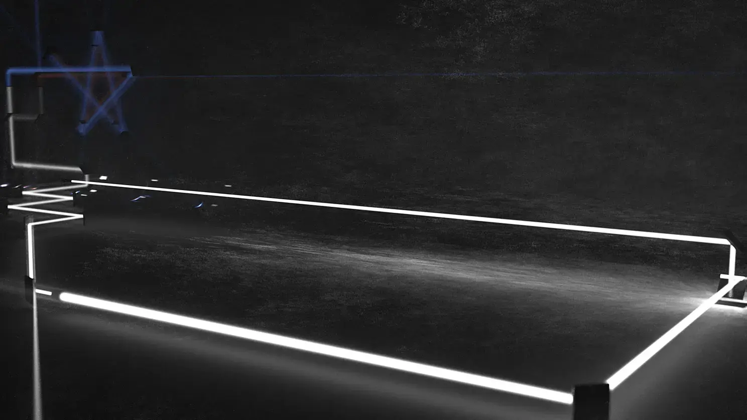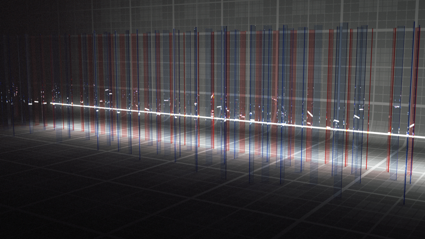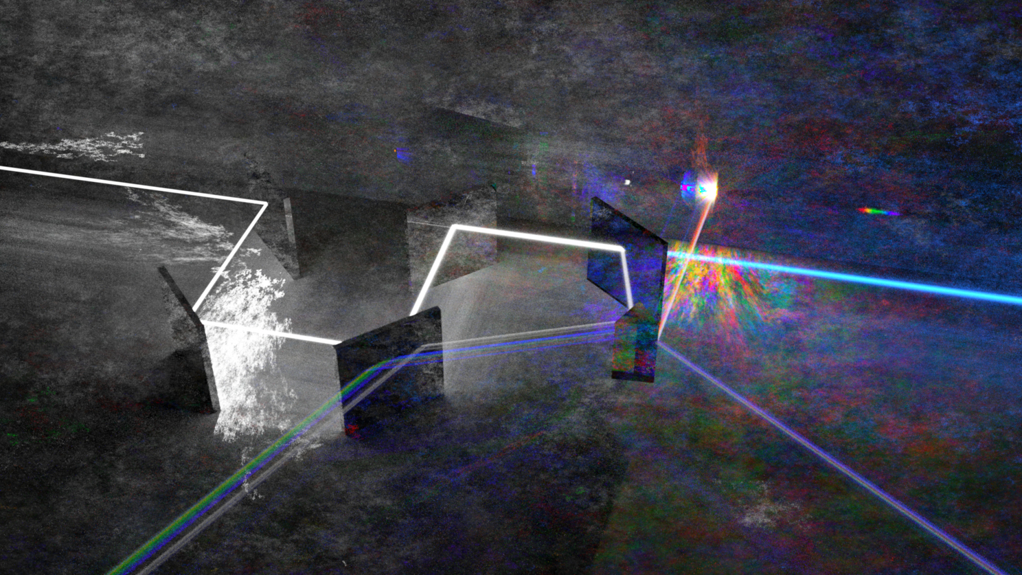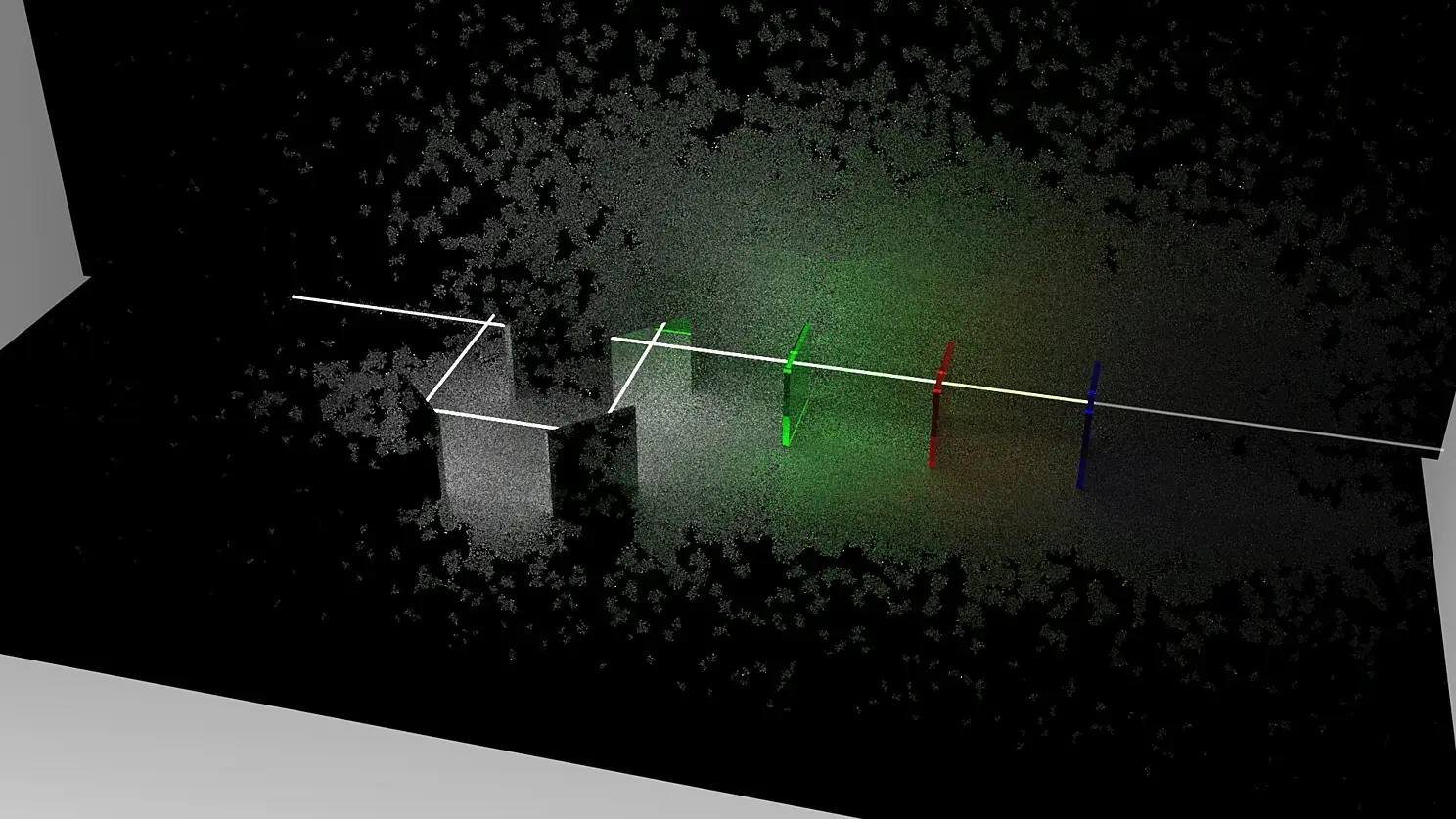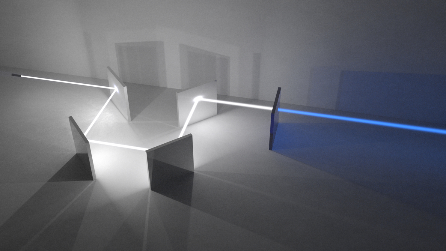 5) Три луча RGB. Это была одна из первых идей - чтобы луч разделялся на три, потом каждый из них окрашивался в цвет той стекляшки, через которую он проходил, a потом лучи уходили бы вверх, и упирались в диффузный потолок, таким образом создавая плавный красно-зелёно-синий градиент освещения сцены. На финальном рендере его почти не видно, из-за того что сам по себе первичный белый луч дал слишком много рассеянного света.