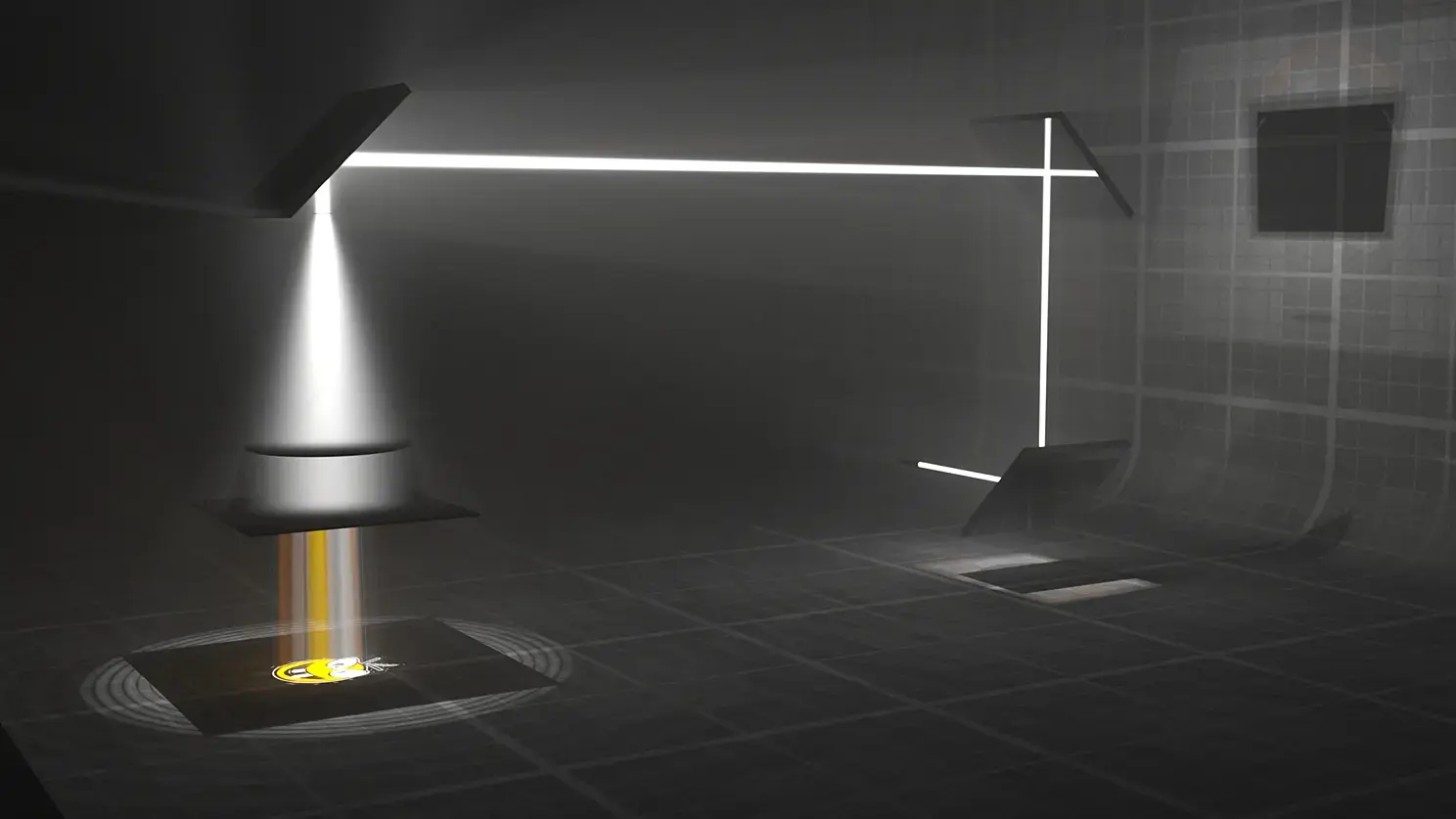А вот так оно должно выглядеть. Куча отражений/преломлений луча, и никаких безумных засветов на полу.