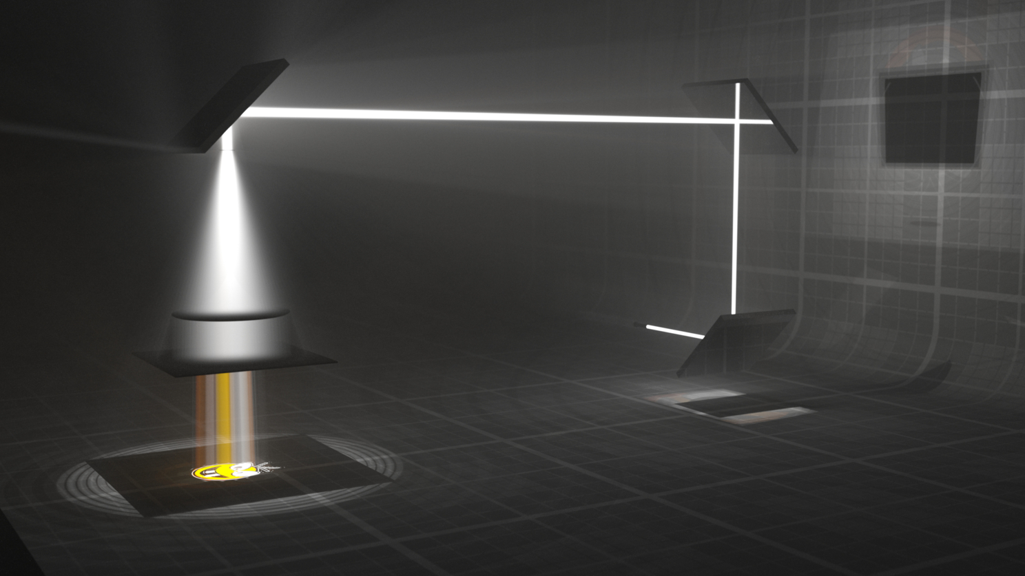 А параллельный направленный пучок света от почти точечного источника - это вообще ад для тру pathtracing-движков. Да ещё и с объёмной каустикой. Но индиго более-менее справился с этим. Тогда я и подумал - а почему бы не сделать сцену с кучей разных элементов. И чтобы вся сцена освещалась одним лишь этим лазерным лучом, без всяких бэкграундных светяшек. Вообще, идея показалась мне прикольной - один единственный небольшой плэйн, который делает всё - лазерные лучи объёмной каустики, и глобалку, и преломления, и проекцию, и дисперсию, всё остальное.