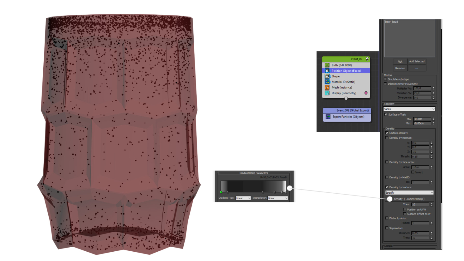 А вот пузырики внутри жидкости, кроме как геометрией делать вариантов не было. Оптимизация тут заключается в почти квадратных пузырьках и скаттеринге только вблизи внешних стенок. Плотность по вертикали задается через градиент.