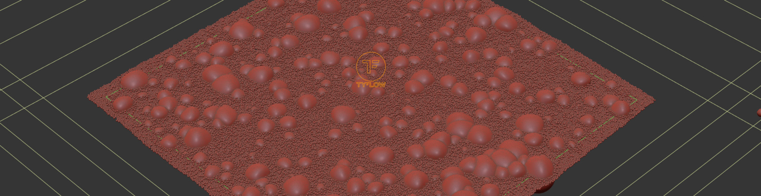 То для получения текстуры капель уже пришлось подрубать tyflow. Логика тут такая: на плоскости рождается кучка мелких капель, потом несколько больших начинают двигаться по извилистой траектории вниз, "собирая" собой эти капли, попутно оставляя хвост из мелких капель. Не самая удачная реализация...