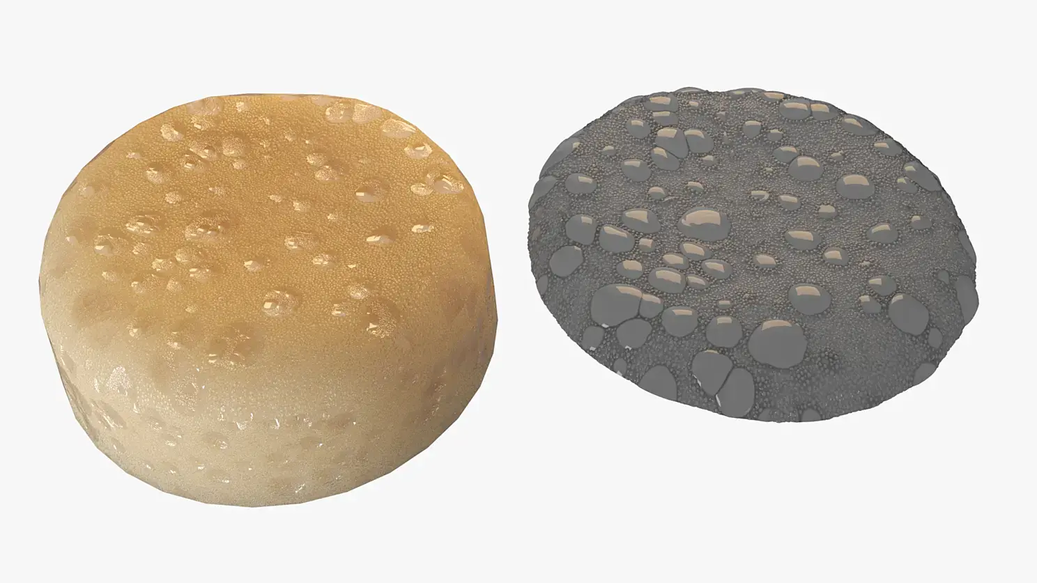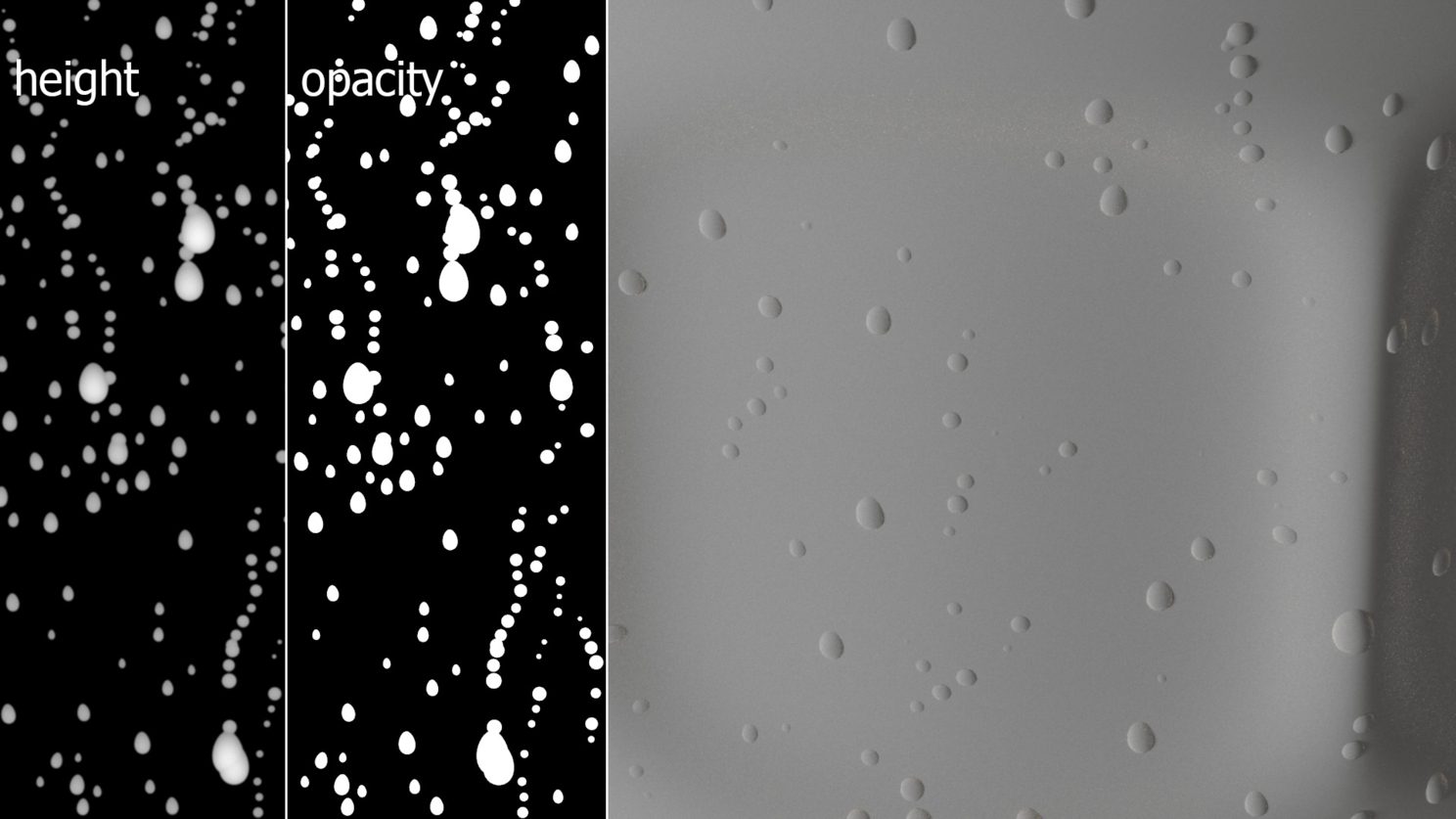 Но из всего этого великолепия мне нужны простые 2D текстуры. С помощью стандартной ортографической камеры были отрендерены всего три Ч/Б текстурки: высота (Gradient Ramp в режиме World Coordinates), окклюзия (VrayDirt), маска по типу пузырьков. Также были получены текстуры для капель на стекле (не забываем, что очередность написанного обратная)