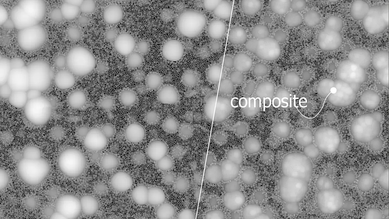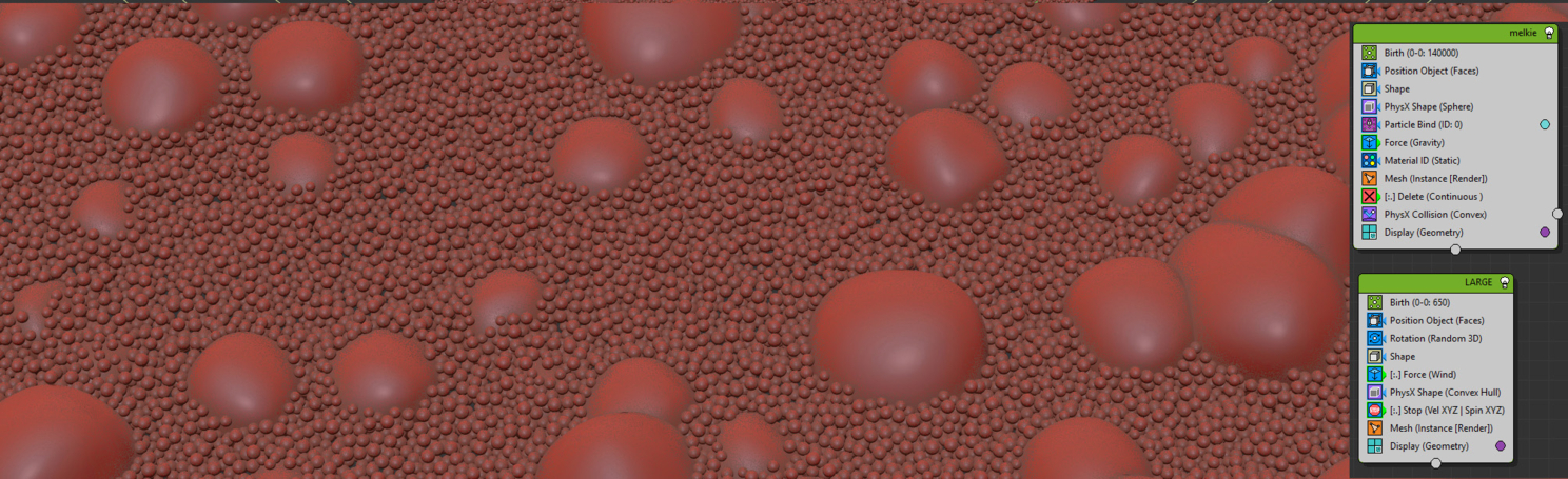 Сразу были отброшены все варианты с процедурными 2D картами, я прикинул, что никакими Cellular я не сделаю пузырики с нужным расположением как по плоскости так и по высоте. Пришлось немного задействовать физику. Примерно полторы сотни тысяч пузыриков "склеены" между собой связями, из под них всплывают до определенного уровня шарики побольше, расталкивая мелкие.