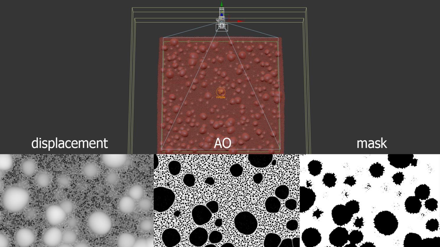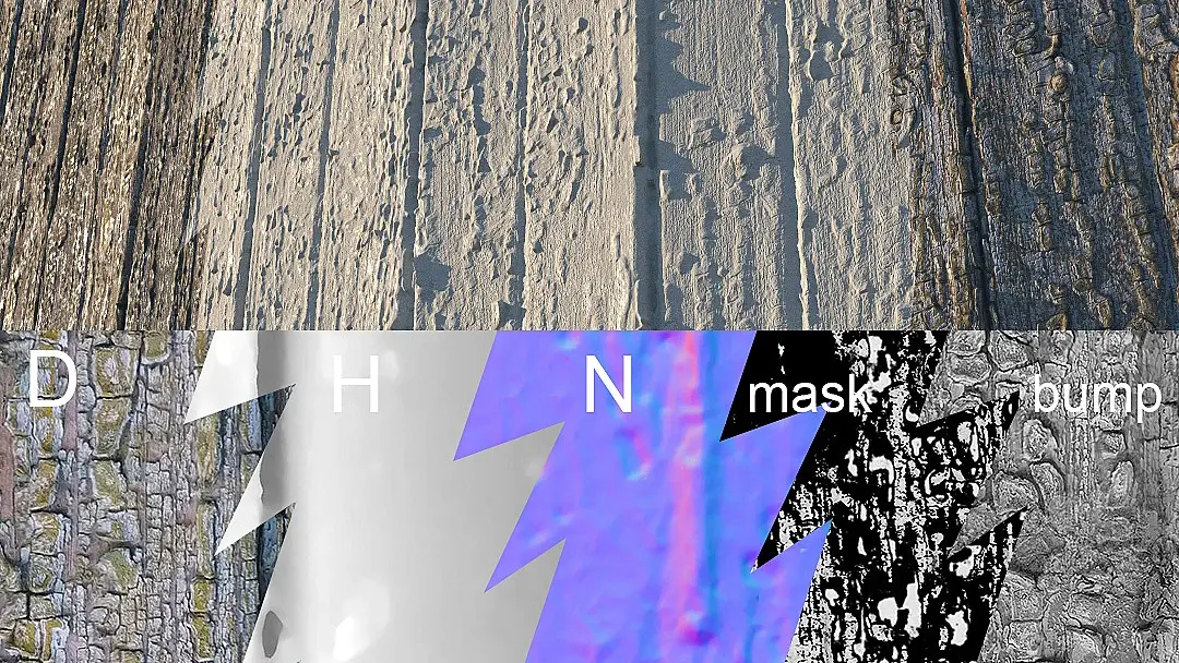 Я использовал эти три текстуры на оба меша, но у внутренней части нужно было добавить фрактальности внутри больших пустот, иначе это как дырки в сыре. Я просто закомпозил эту же текстуру по маске c увеличенной повторяемостью.