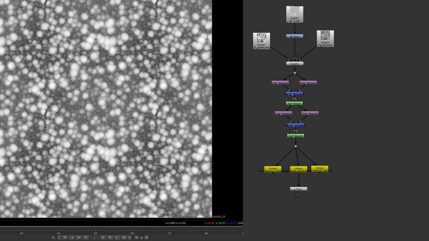 В нюке была произведена небольшая корректировка яркостей, нормализация градиента. Нехитрым способом с помощью ноды RotoPaint сделана бесшовность. На такой шумной структуре эта бесшовность особо и не нужна, но пущай будет. Кстати, для любознательных экспериментаторов я приложу эти готовые текстуры архивом .
